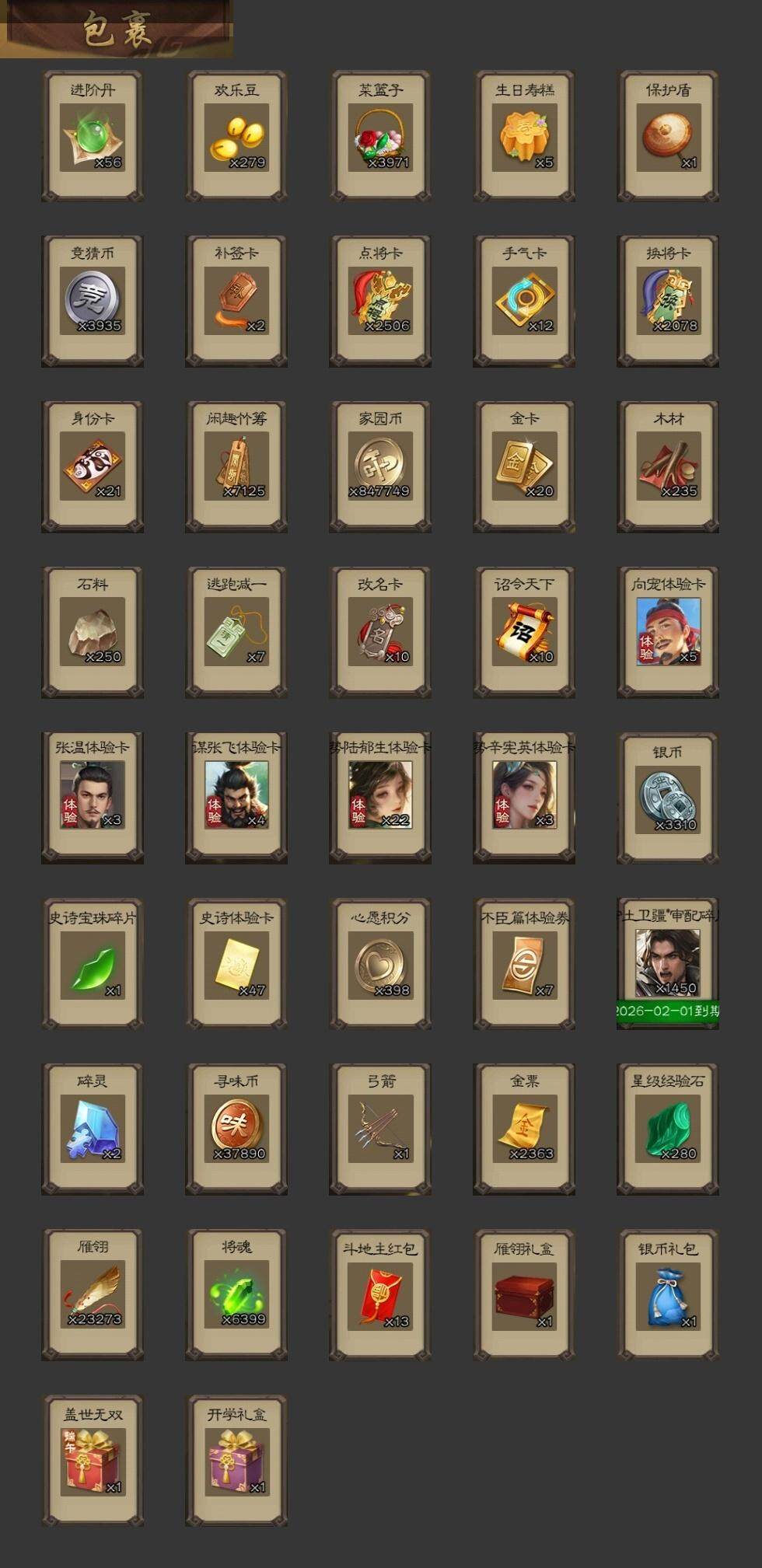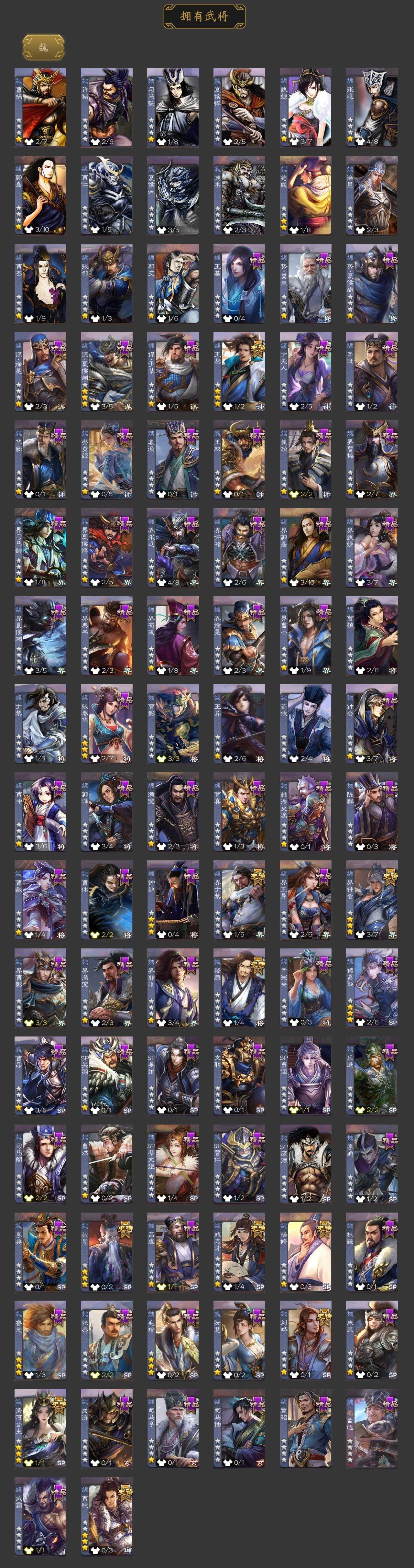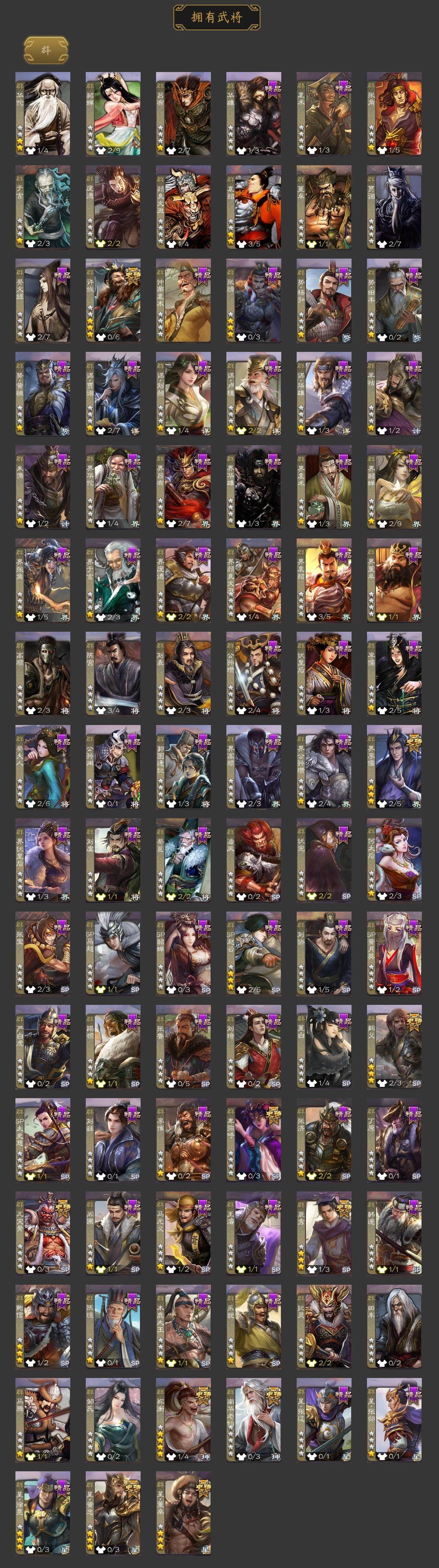 神吕布,神陆逊,神太史慈,神吕蒙,神周瑜,神诸葛亮,王粲,杨修,界钟会,界于禁,嵇康,曹纯,戏志才,刘晔,清河公主,关索,诸葛瞻,赵襄,张星彩,沙摩柯,傅佥,花鬘,谋关羽,吴景,骆统,留赞,界徐盛,势陆郁生,势太史慈,谋黄月英,裴秀,星黄忠,麹义,南华老仙,祢衡,界李儒,卑弥呼,鲍信,