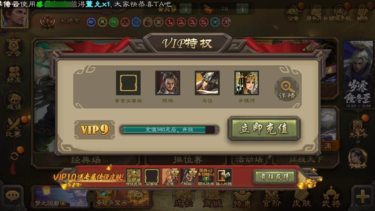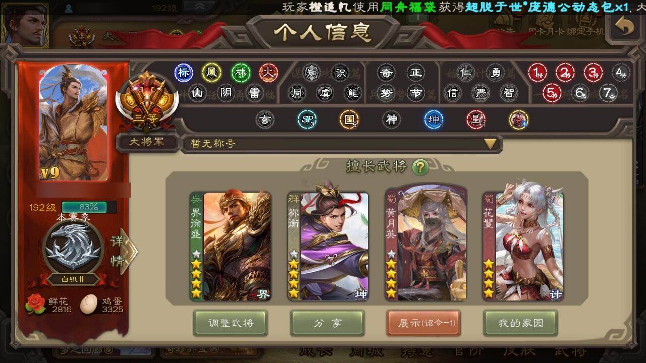 官阶:大将军;VIP等级:VIP9;史诗武将数量:37;动态皮肤数量:26;