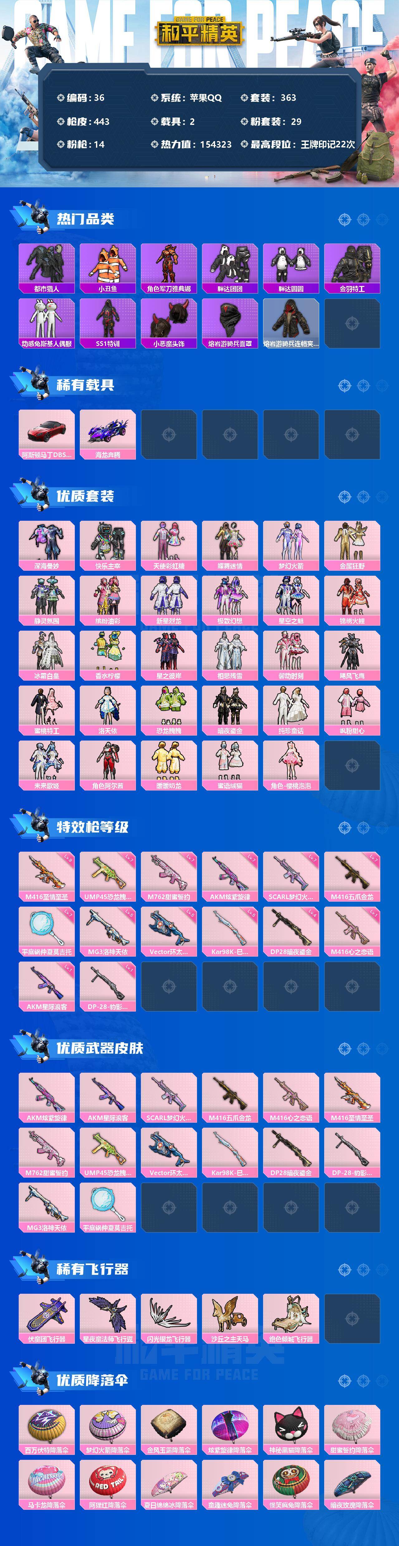 【商品标题】:苹果 手Q-29粉装-14特效枪-2载具-5粉色飞行器-154323热力值-22王牌印记-363套装-443枪皮