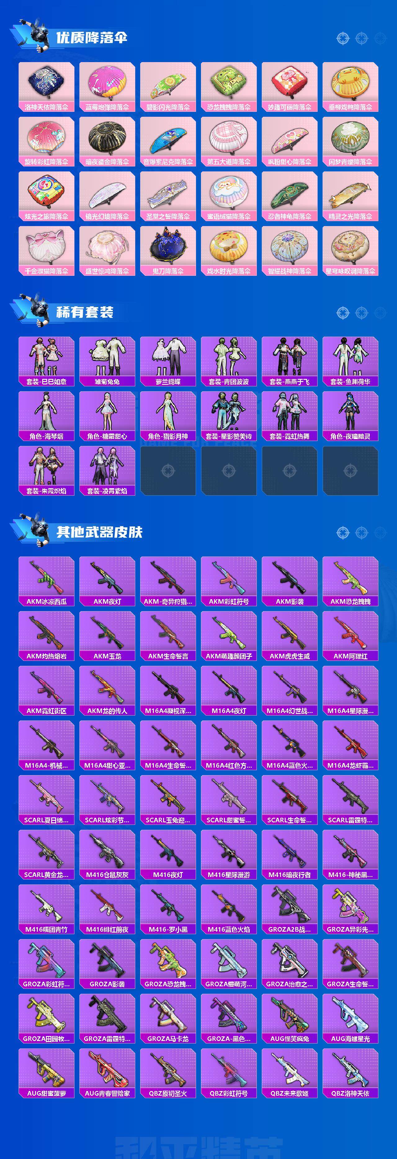 【热门品类】:粉装-梦幻火箭,粉装-缤纷油彩,套装-浪漫天命,套装-都市猎人,套装-小丑鱼,套装-奇异狩猎者,角色-军刀雅典娜,套装-胖达团团,套装-胖达圆圆,套装-黄金大亨,套装-金羽特工,套装-动感兔斯基人偶服,角色-2B战斗服款,套装-SS1特训,套装-龟仙人,套装-潮萌小黄鸭,套装-暗影哥特,套装-浪漫波比,套装-粉红小猪,小恶魔头饰,熔岩游骑兵面罩,M416-