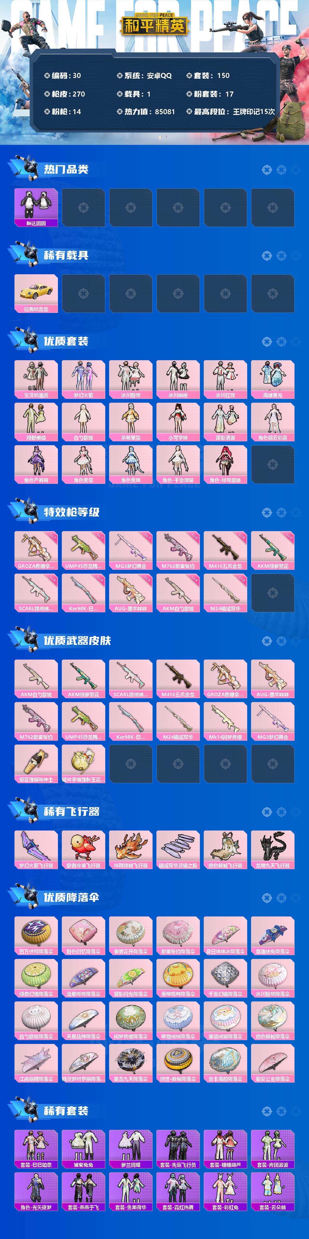 【商品标题】:安卓 手Q-17粉装-14特效枪-1载具-7粉色飞行器-85081热力值-15王牌印记-150套装-270枪皮