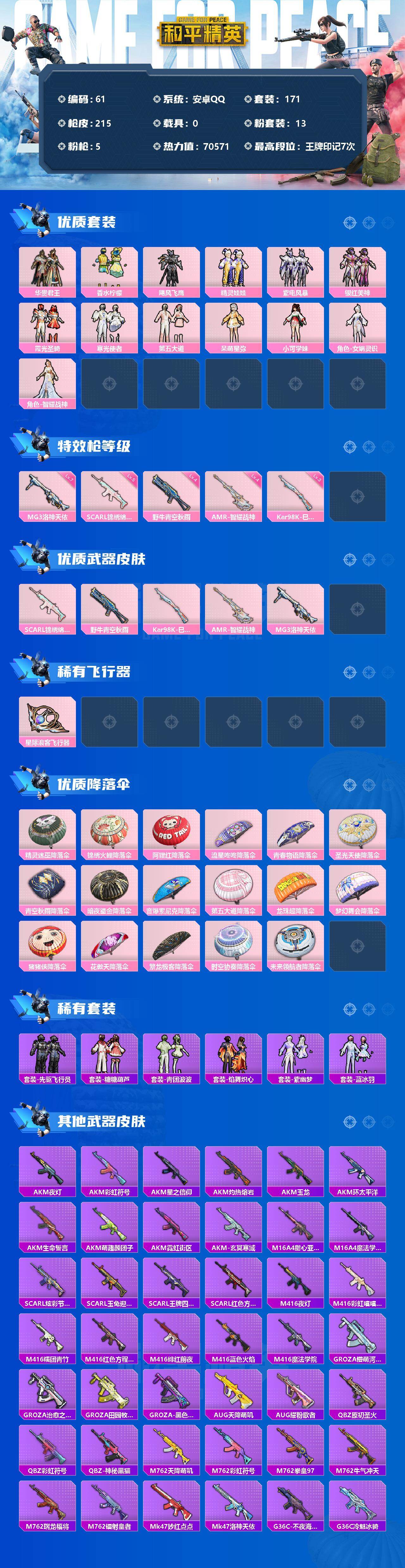 【商品标题】:安卓 手Q-13粉装-5特效枪-0载具-1粉色飞行器-70571热力值-7王牌印记-171套装-215枪皮
