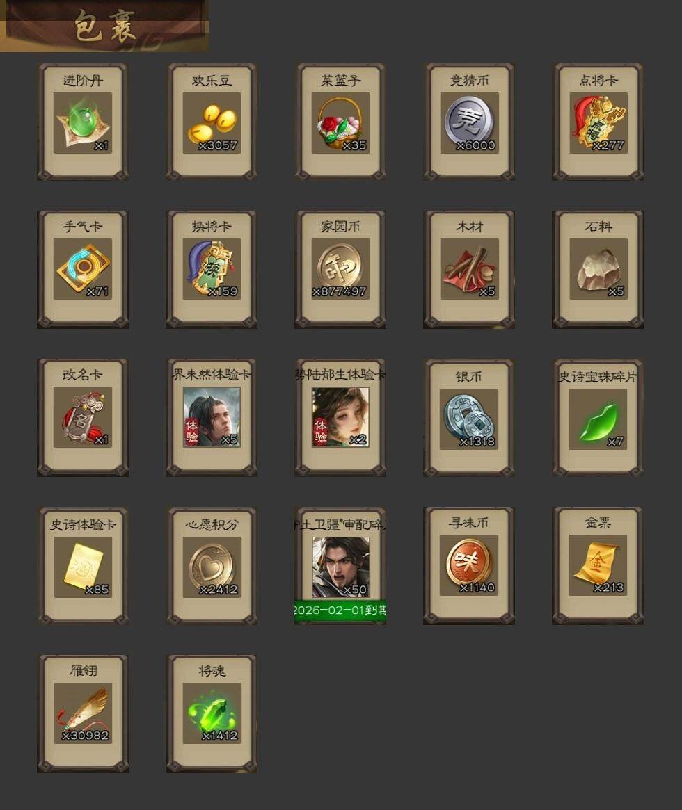 官阶:骠骑将军;VIP等级:VIP10;史诗武将数量:25;动态皮肤数量:12;武将总数:328;史诗宝珠数量:0;将魂数量:1412;神将:6;魏国史诗武将:6;蜀国史诗武将:5;吴国史诗武将:2;群史诗武将:7