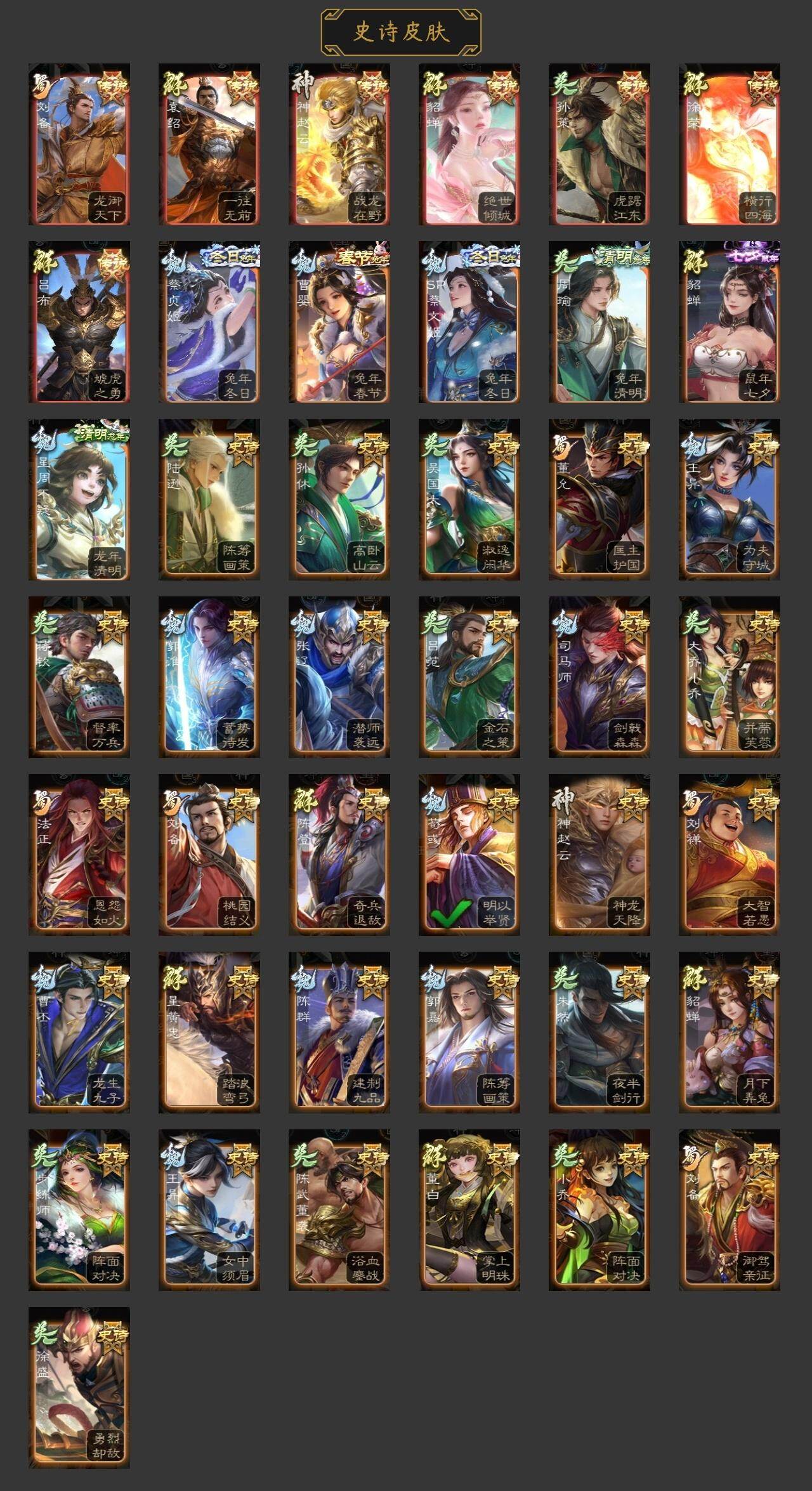 神赵云,神张辽,神荀彧,神吕蒙,神周瑜,神诸葛亮,谋曹仁,杨修,界钟会,嵇康,陈琳,曹纯,谋赵云,谋马超,沙摩柯,界黄忠,花鬘,吴景,界徐盛,谋貂蝉,徐荣,星黄忠,苏飞,审配,南华老仙,许攸,神赵云-战龙在野(动态),神赵云-神龙天降,星周不疑-龙年清明(动态),SP蔡文姬-兔年冬日