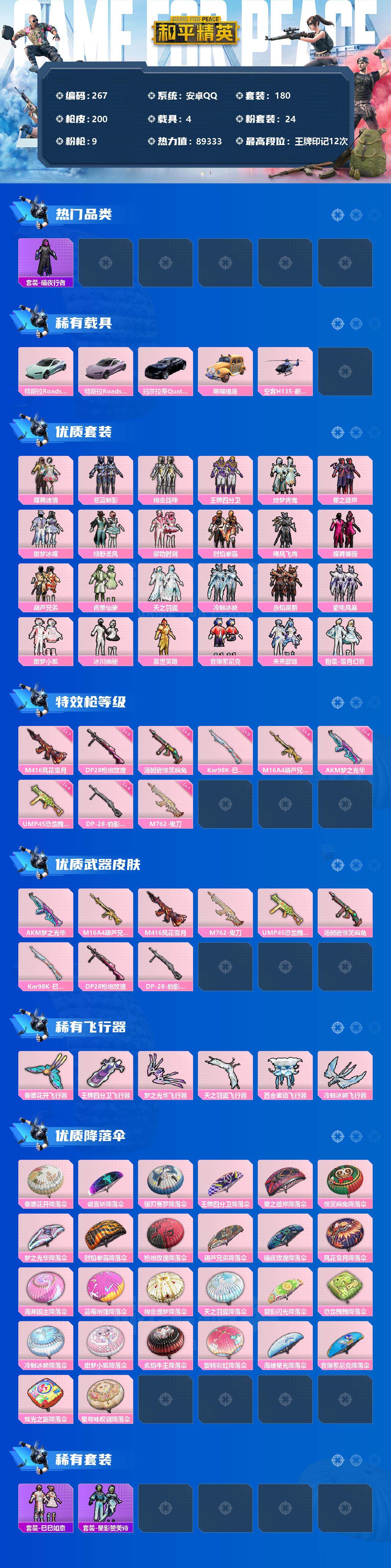 【商品标题】:安卓 手Q-24粉装-9特效枪-4载具-6粉色飞行器-89333热力值-12王牌印记-180套装-200枪皮