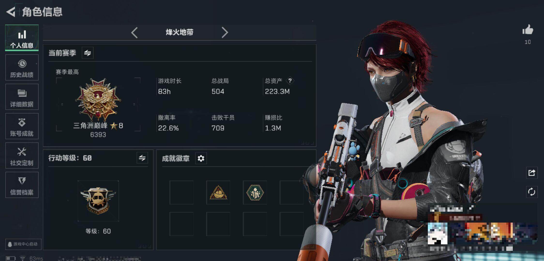 总资产:223.3M,哈夫币:1712W,武器皮肤130,烽火60级:三角洲巅