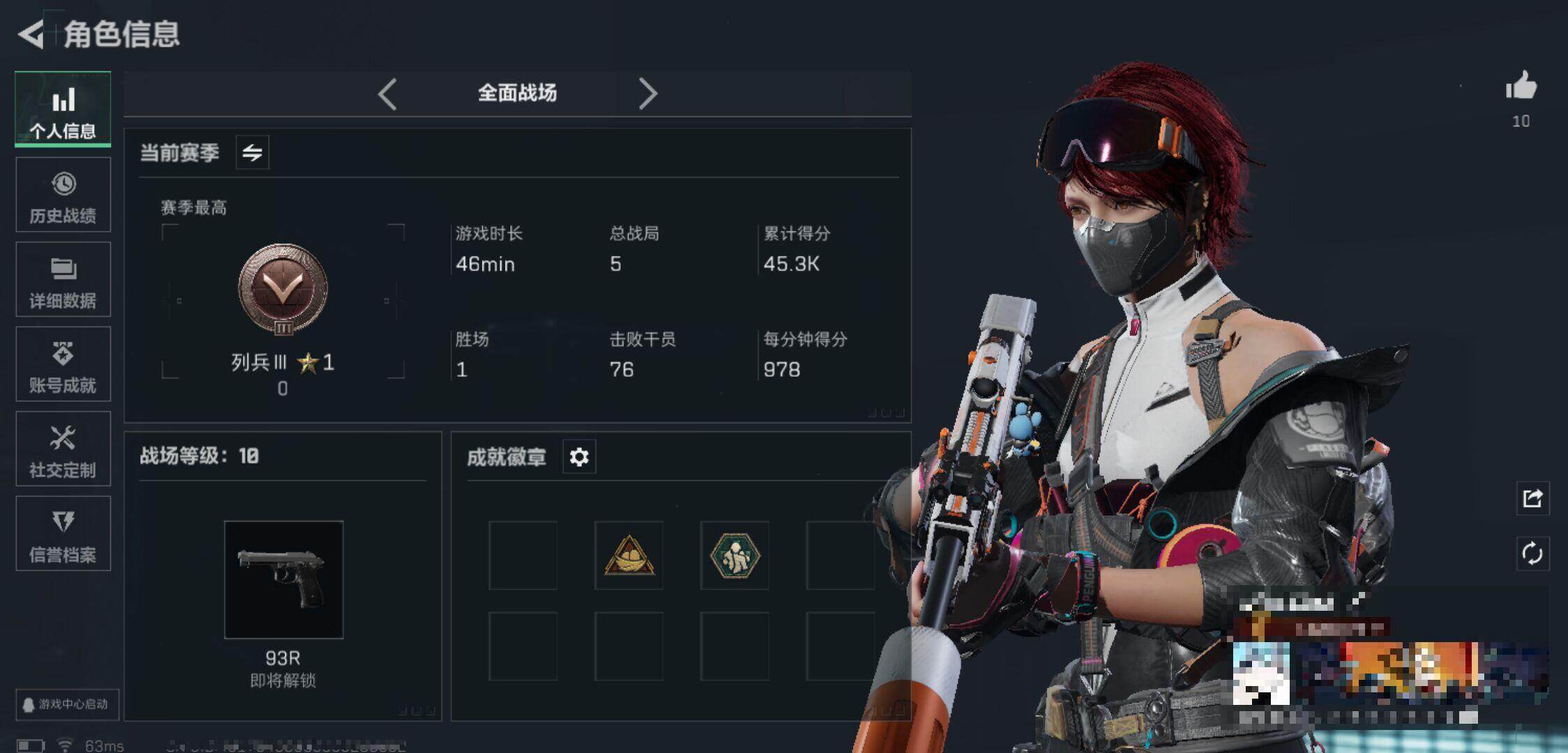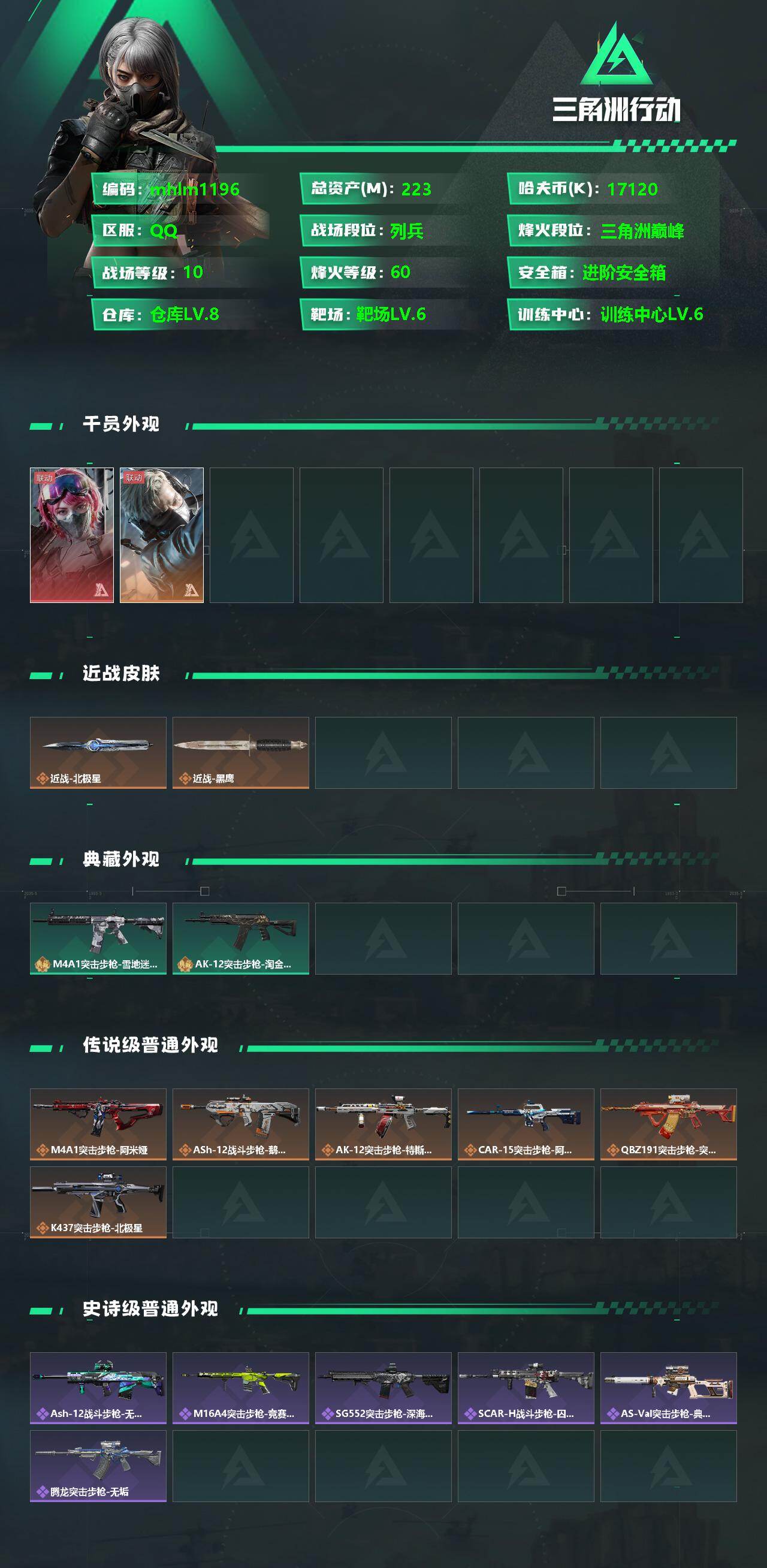 总资产:223.3M,哈夫币:1712W,武器皮肤130,烽火60级:三角洲巅峰,战场10级:列兵,通行证70级:烽火地带限定版 【安全箱】高级安全箱;【特勤处等级】仓库LV.8,指挥中心LV.3,训练中心LV.6,靶场LV.6,潜水中心LV.0,收藏室LV.2;【干员皮肤2】:蛊能天使午夜邮差,蜂医送葬人无题密令;【已有捆绑包5】:北极星捆绑包,捞点薯条捆绑包,特斯拉线圈捆绑包,能天使午夜邮差捆绑包,鹅鸭杀捆绑包;【近战皮肤】:近战武器-北极星,近战武器-黑鹰;【步枪皮肤】:M4A1突击步枪-