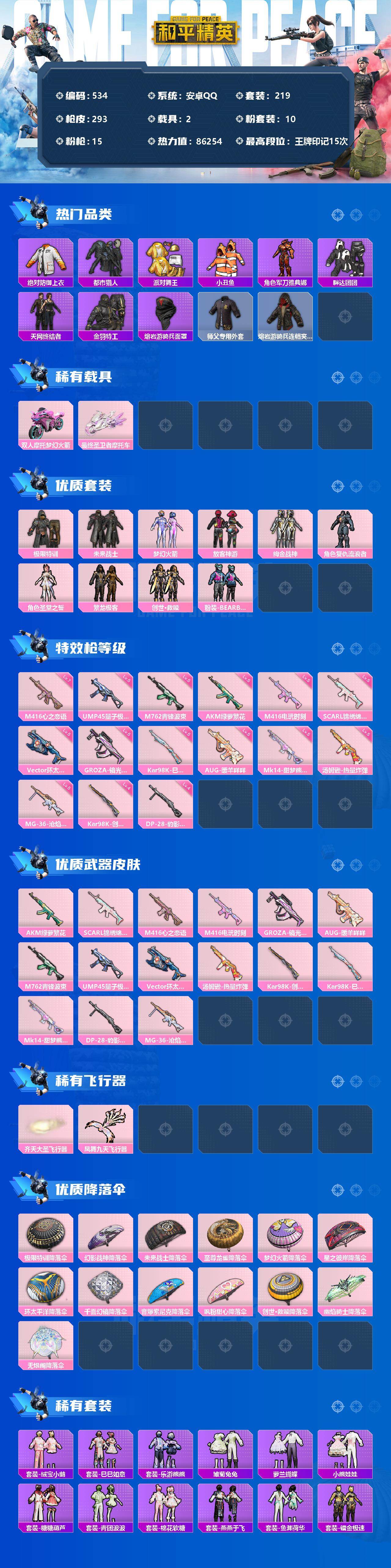【商品标题】:安卓 手Q-10粉装-15特效枪-2载具-5粉色飞行器-86254热力值-15王牌印记-219套装-293枪皮