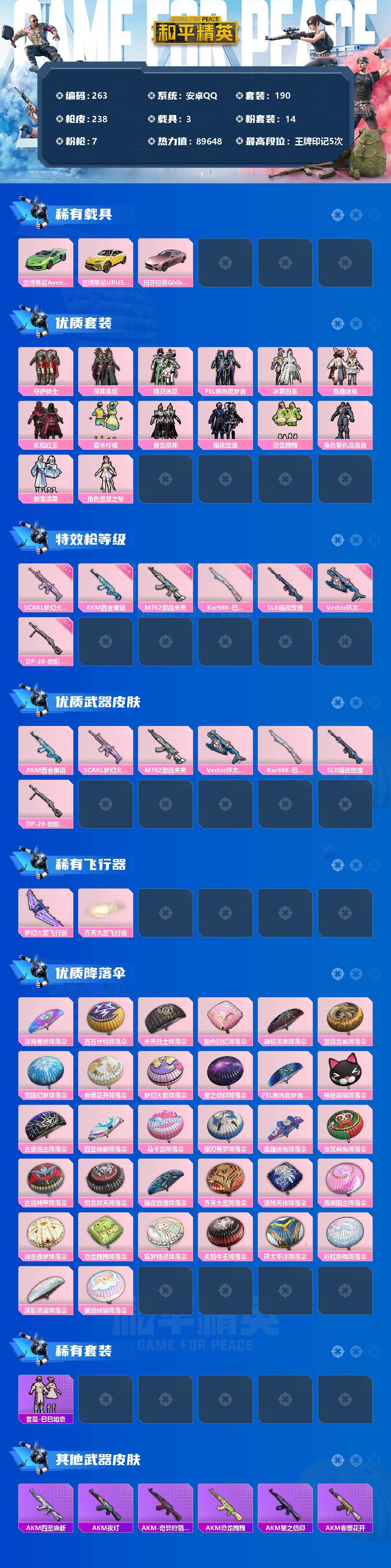 【商品标题】:安卓 手Q-14粉装-7特效枪-3载具-2粉色飞行器-89648热力值-5王牌印记-190套装-238枪皮