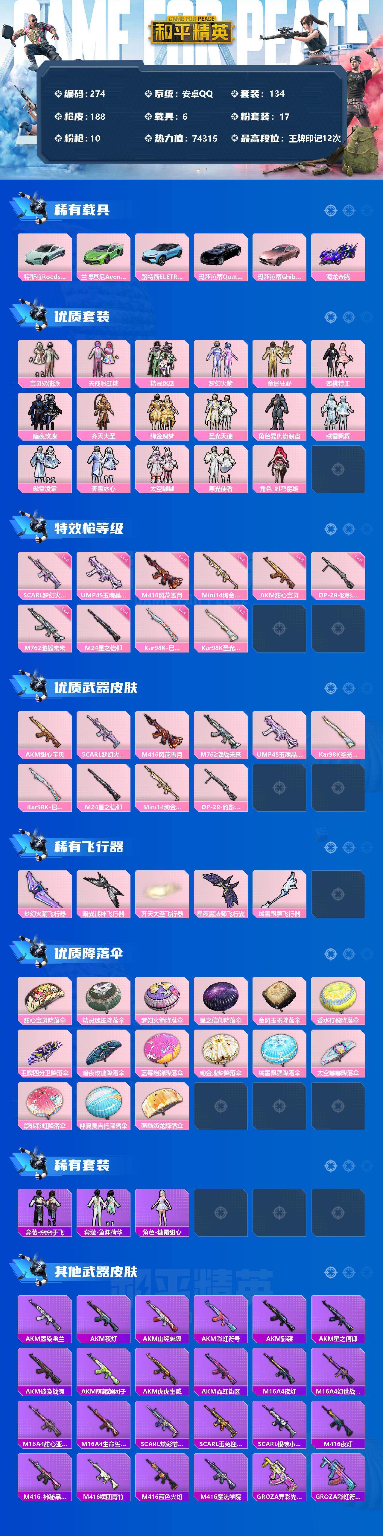 【商品标题】:安卓 手Q-17粉装-10特效枪-6载具-5粉色飞行器-74315热力值-12王牌印记-134套装-188枪皮