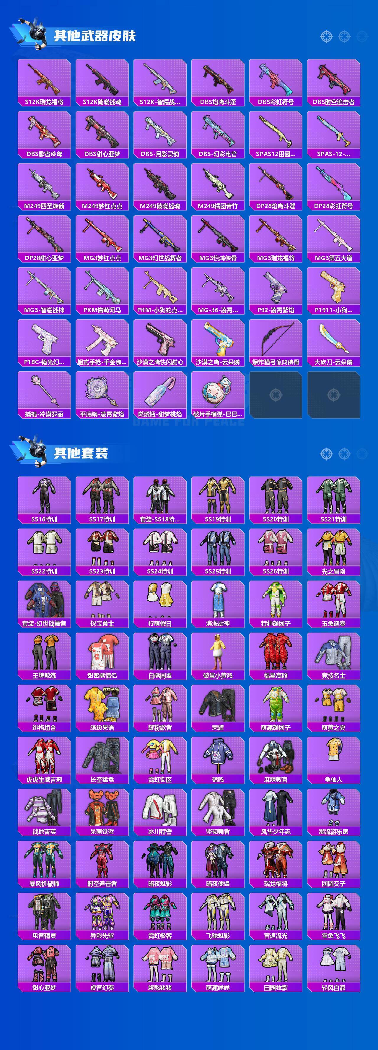 【粉色套装】:粉装-梦幻火箭,粉装-新星烈龙,粉装-甜蜜誓约,粉装-冰霜白皇,粉装-炙焰红王,粉装-彩虹鹿灵,粉装-山涧鹿灵,角色-圣堂之誓,角色-千金淑猫,角色-脆鲨七海,角色-月影灵韵,粉装-幻彩电音