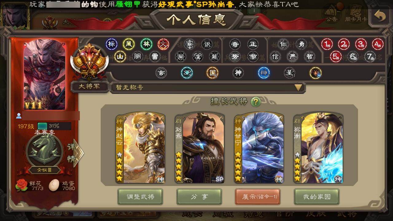 官阶:大将军;VIP等级:VIP11;史诗武将数量:58;动态皮肤数量:40