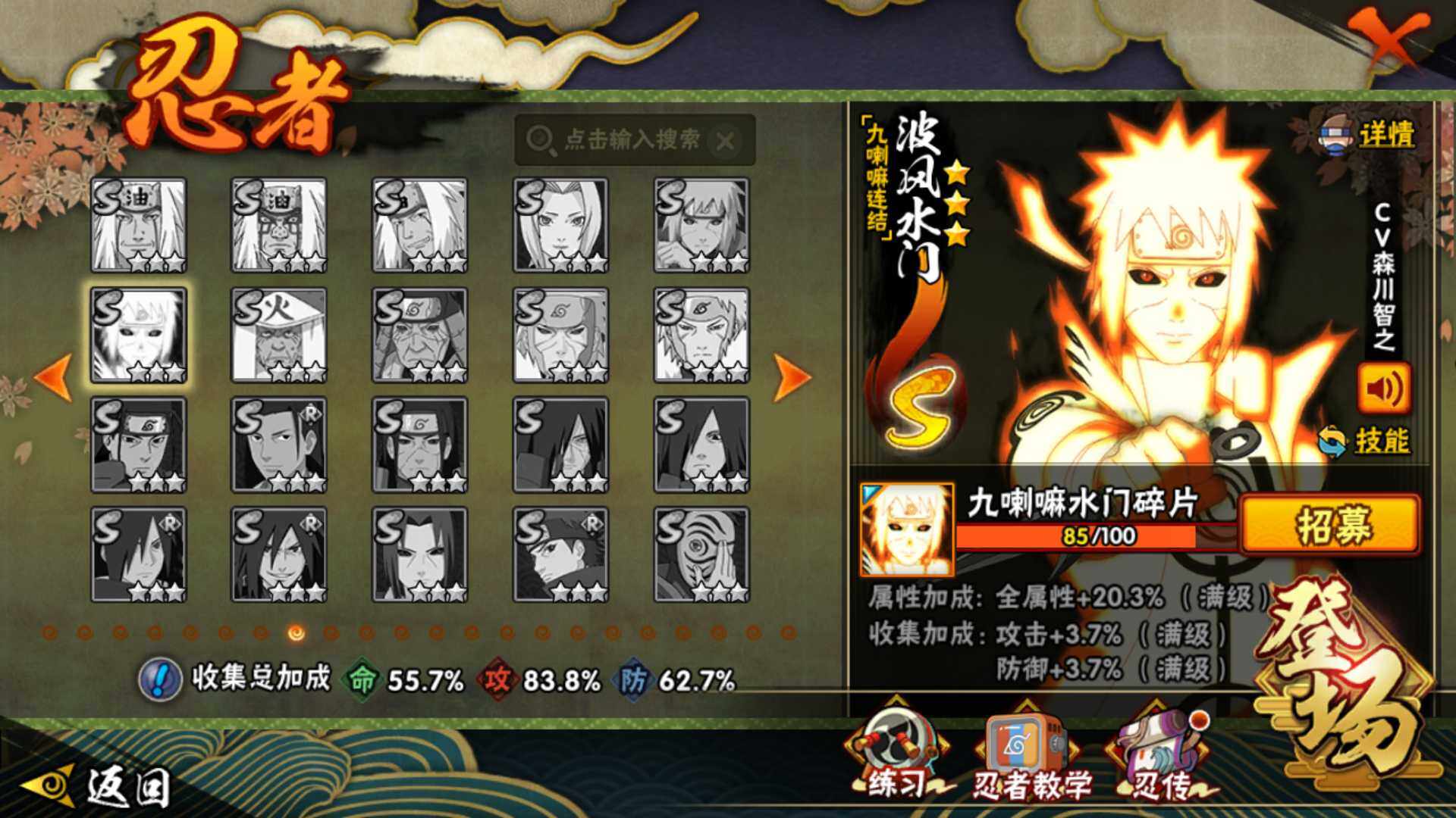 【S级忍者】:宇智波斑「秽土转生·解」(3星),春野樱「忍界大战」(3星),宇智波鼬「须佐能乎」(3星),旗木卡卡西「须佐能乎」(3星),自来也「舞之豪杰」(3星),大蛇丸(3星),纲手「百豪」(3星),波风水门(3星),神秘面具男「红夜之刃」(3星),迈特凯「死门」(3