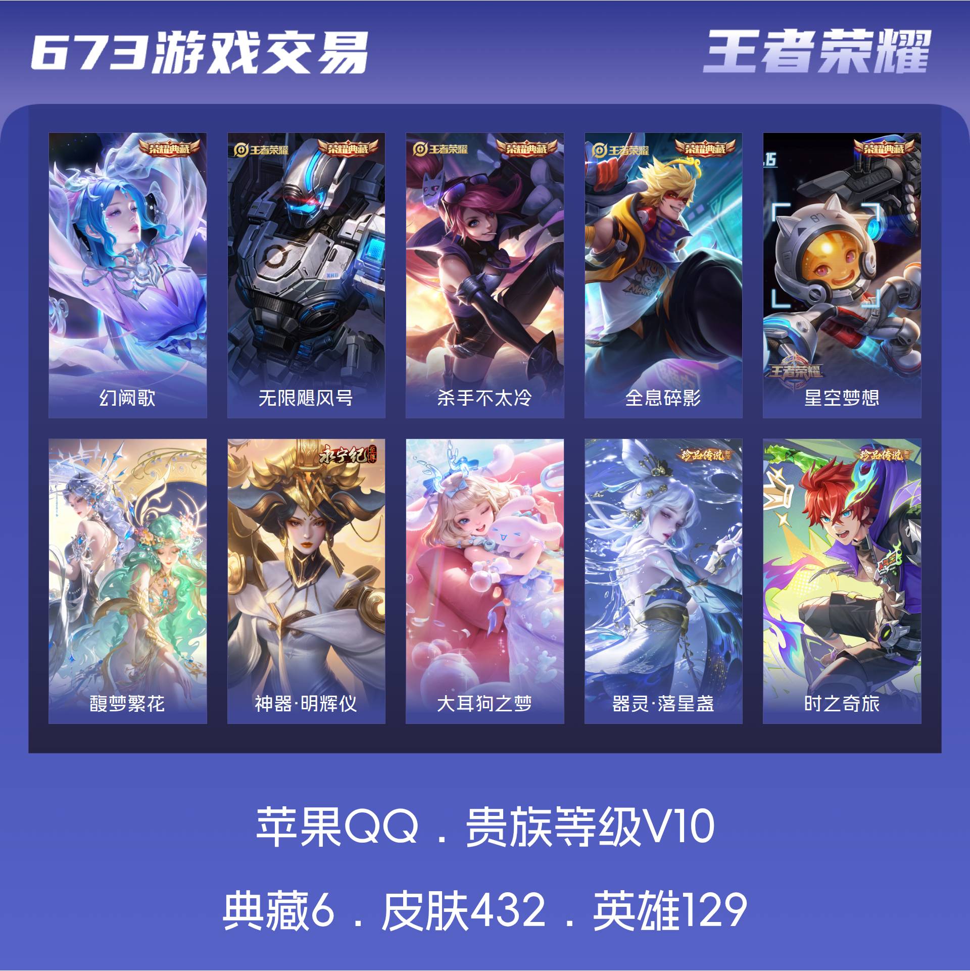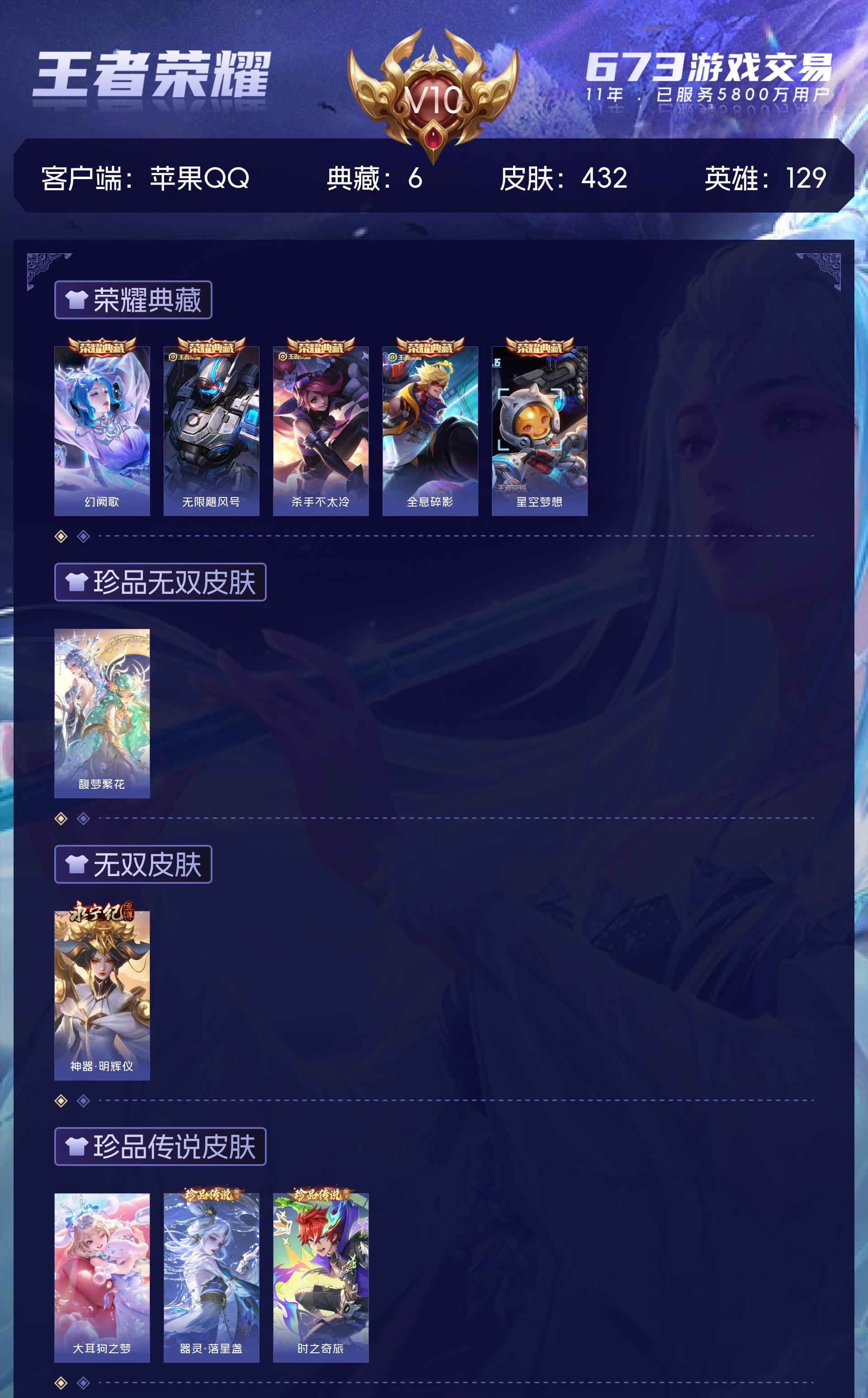 苹果QQ/永恒钻石/432皮肤/129英雄/5典藏/1珍品无双/1无双/3珍品传说/51传说/118