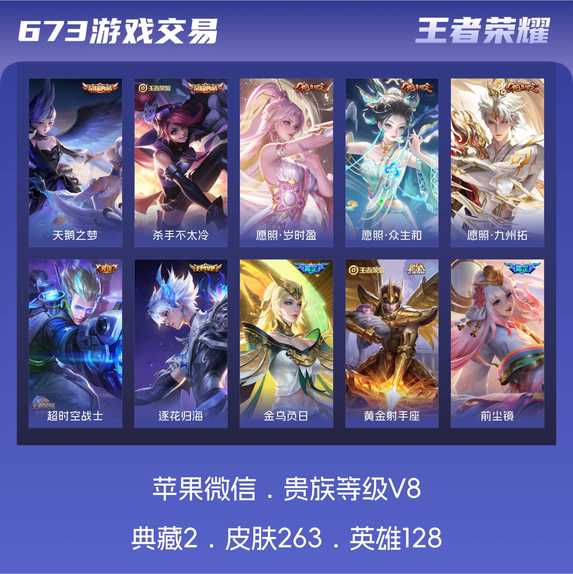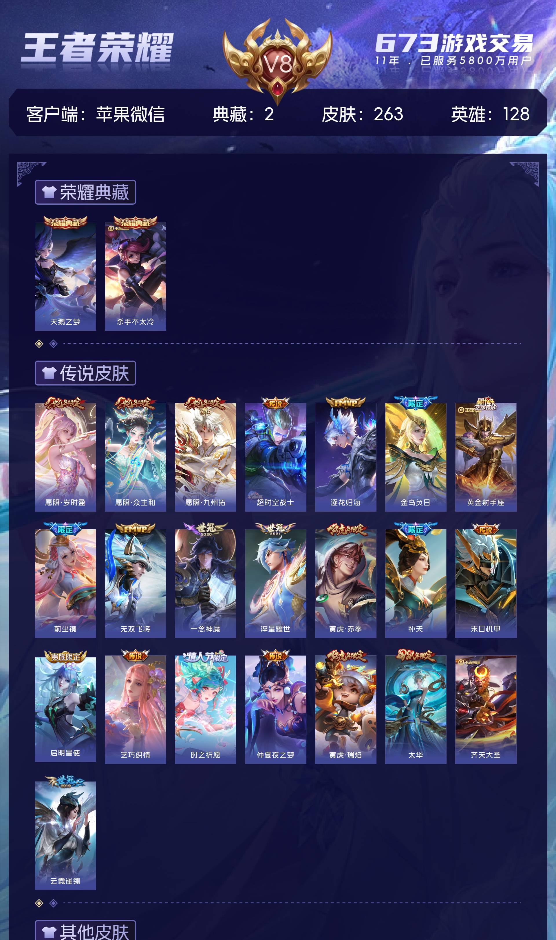 苹果微/至尊星耀/263皮肤/128英雄/2典藏/0珍品无双/0无双/0珍品传说/21传说/73史