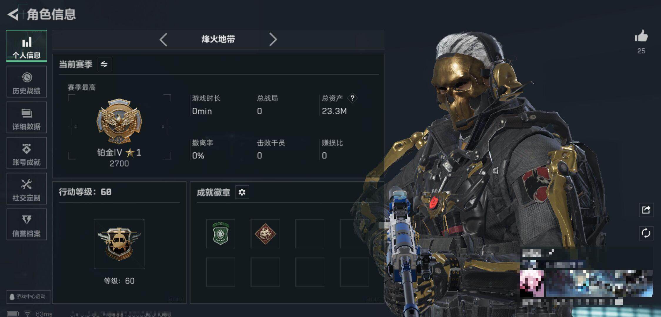 总资产:23.3M,哈夫币:4W,武器皮肤216,烽火60级