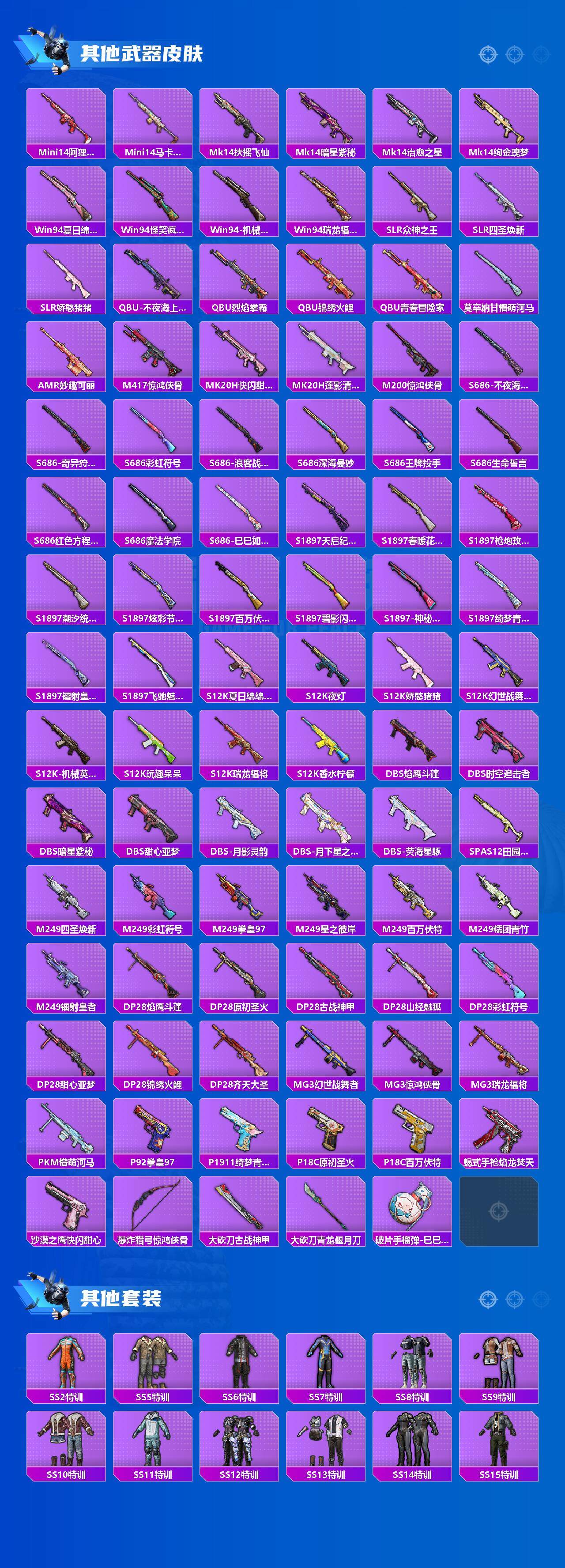 【热门品类】:粉装-梦幻火箭,套装-奇异狩猎者,套装-SS1特训,角色-忠猛周仓,角色-忠真马岱,角色-忠义严颜,旭日初心兜帽大衣,套装-龟仙人,套装-粉红小猪,角色-8号机,熔岩游骑兵面罩,大砍刀-青龙偃月刀,撬棍-龙胆亮银枪