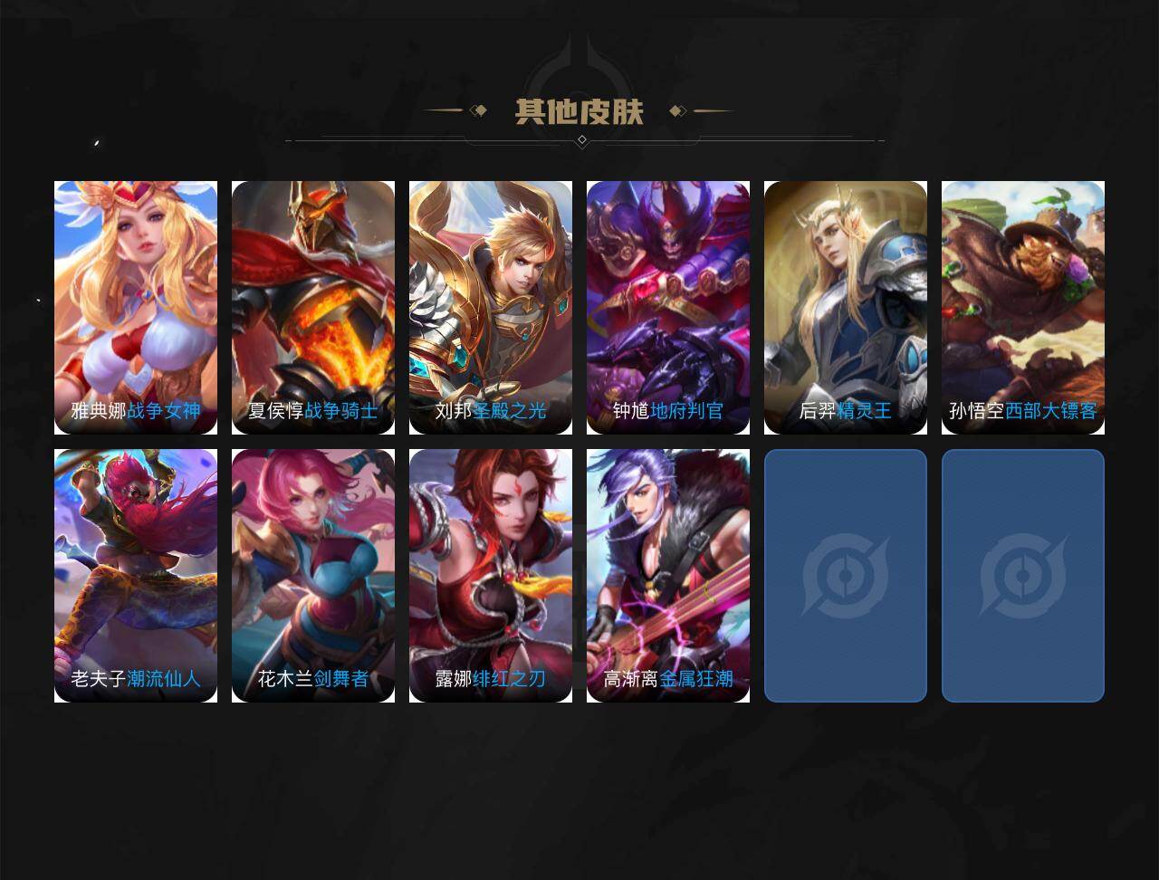 【传说皮肤】:马超神骥逐星野,花木兰异界灵契,杨戬纵目迁山,干将莫邪千山共赴,桑启鸣野蒿,典韦战鼓燎原,吕布怒海麟威,马可波罗深海之息,李信一念神魔,梦奇胖达荣荣,