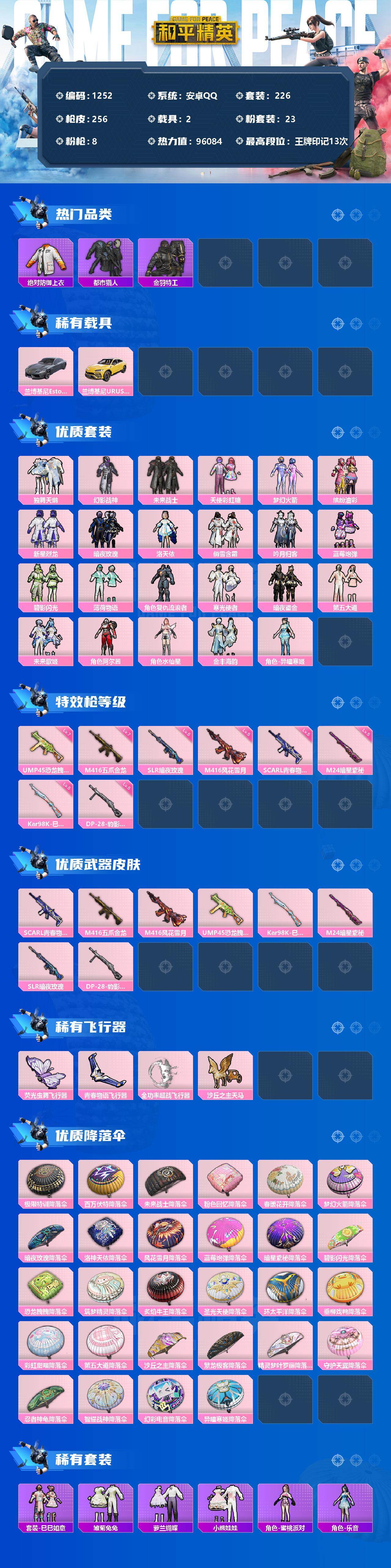 【商品标题】:安卓 手Q-23粉装-8特效枪-2载具-4粉色飞行器-96084热力值-13王牌印记-226套装-256枪皮