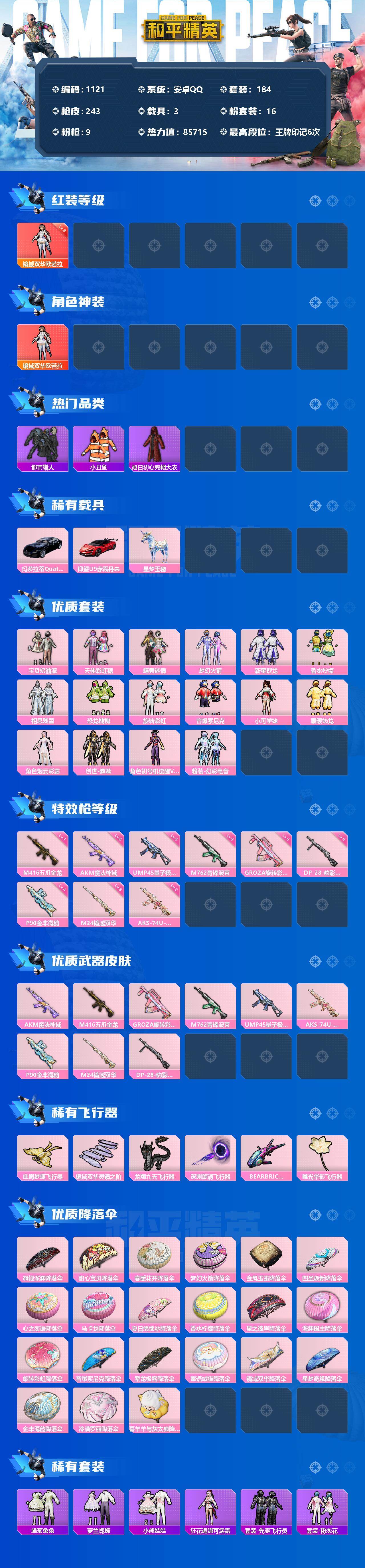 【商品标题】:安卓 手Q-1神装-16粉装-9特效枪-3载具-6粉色飞行器-85715热力值-6王牌印记-184套装-243枪皮