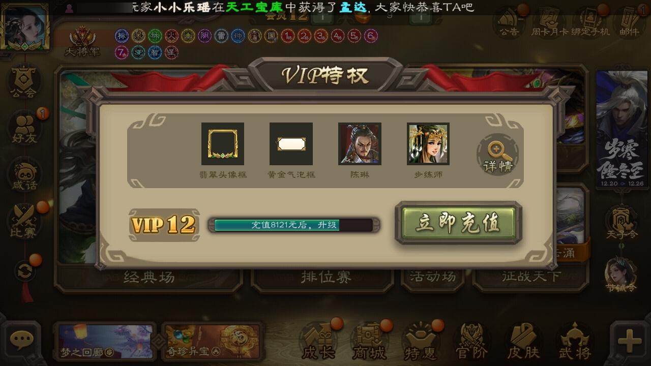 官阶:大将军;VIP等级:VIP12;史诗武将数量:66;动态皮肤数量:38