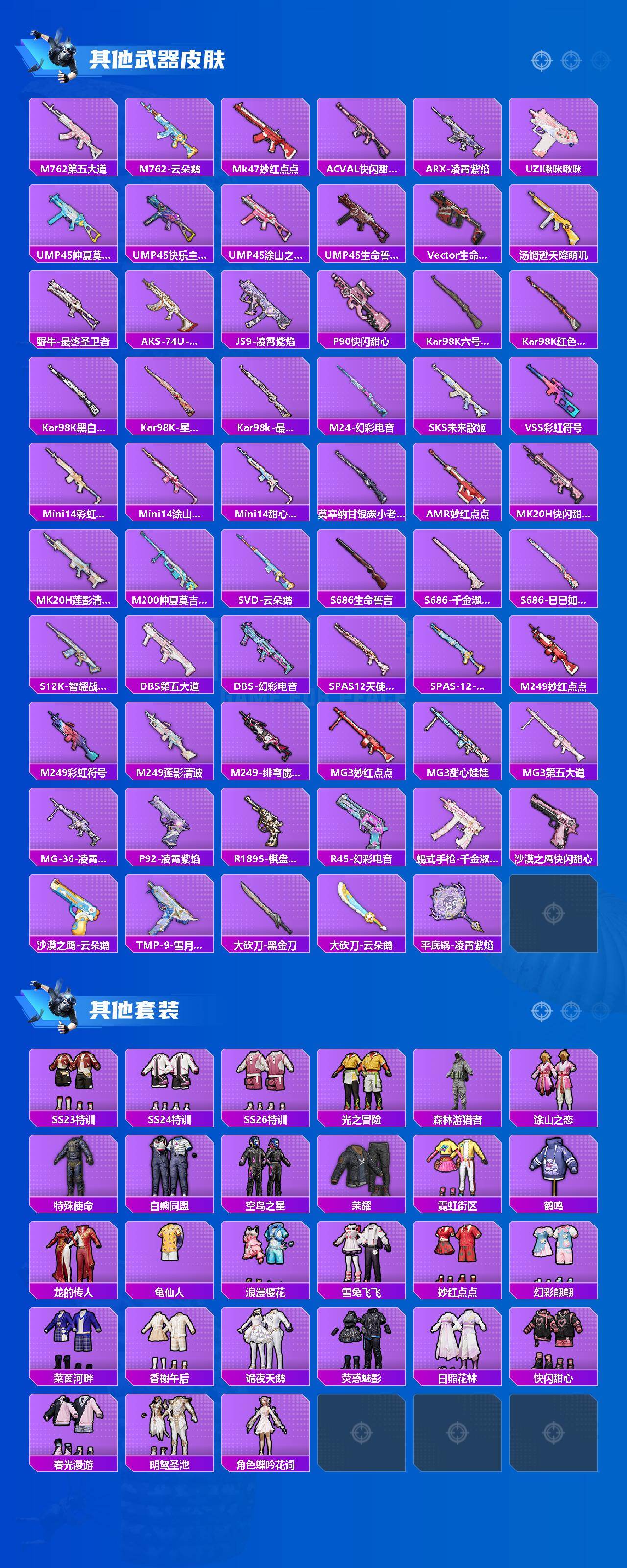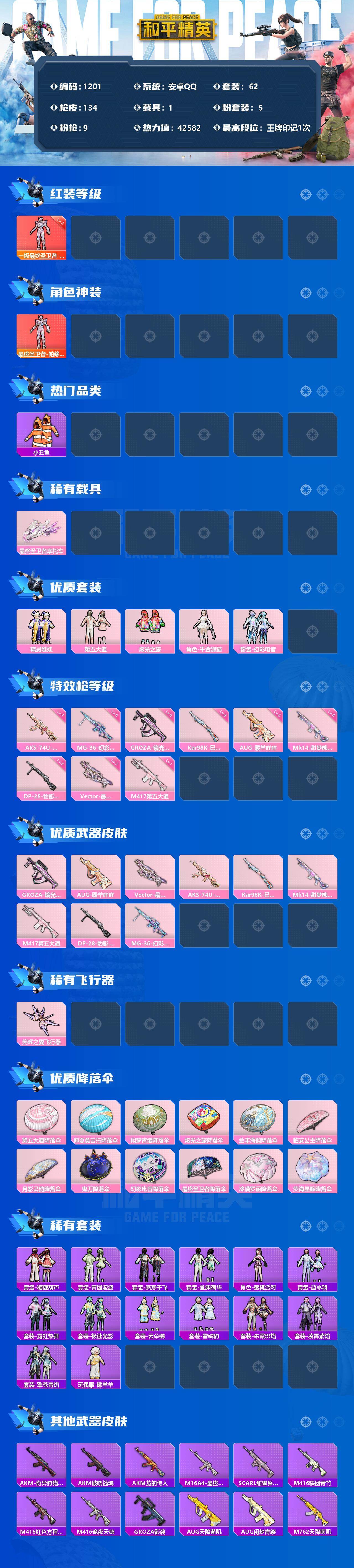 【商品标题】:安卓 手Q-1神装-5粉装-9特效枪-1载具-2粉色飞行器-42582热力值-1王牌印记-62套装-134枪皮