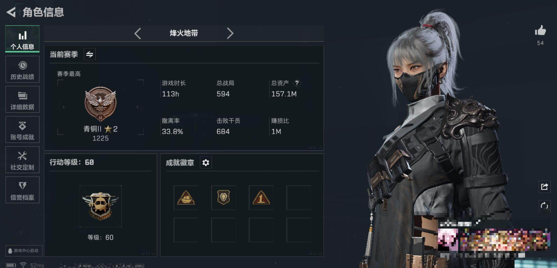 总资产:157.1M,哈夫币:3568W,武器皮肤93,烽火60级