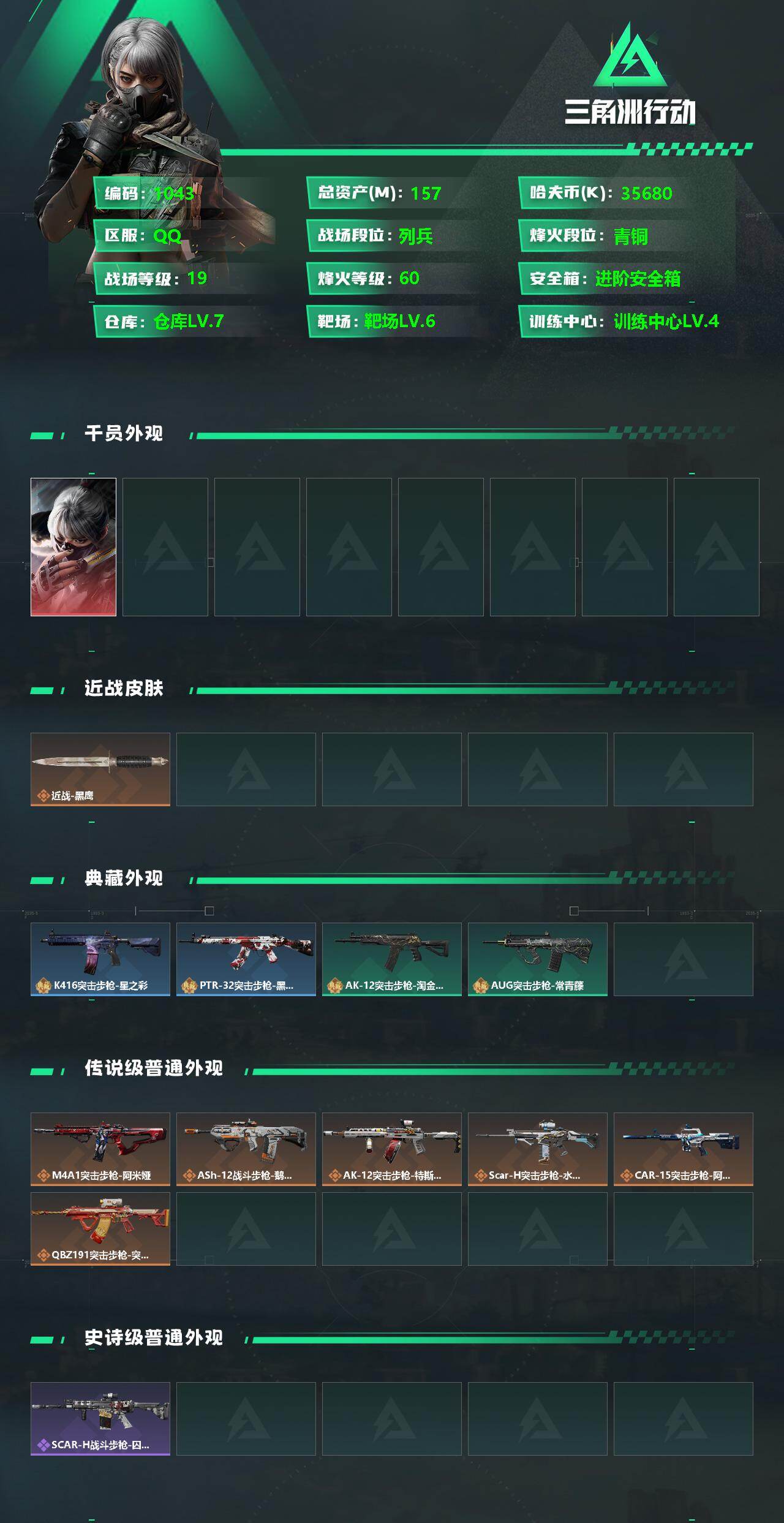总资产:157.1M,哈夫币:3568W,武器皮肤93,烽火60级:青铜,战场19级:列兵,通行证61级:烽火地带限定版 【安全箱】高级安全箱;【特勤处等级】仓库LV.7,指挥中心LV.5,训练中心LV.4,靶场LV.6,潜水中心LV.1,收藏室LV.0;【干员皮肤1】:骇爪水墨云图;【已有捆绑包3】:捞点薯条捆绑包,特斯拉线圈捆绑包,鹅鸭杀捆绑包;【近战皮肤】:近战武器-黑鹰;【步枪皮肤】:M4A1突击步枪-蚀金玫瑰,SCAR-H战斗步枪-水墨云图,ASh-12战斗步枪-鹅鸭杀,SCAR-H战
