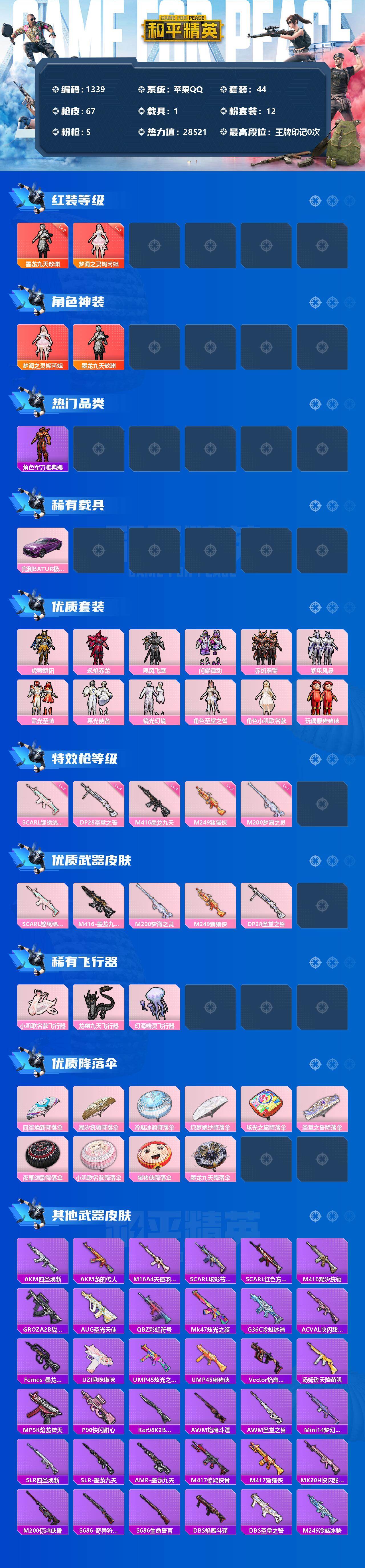 苹果 手Q-2神装-12粉装-5特效枪-1载具-3粉色飞行器-28521热力值-1王牌印记-44套装-67枪皮