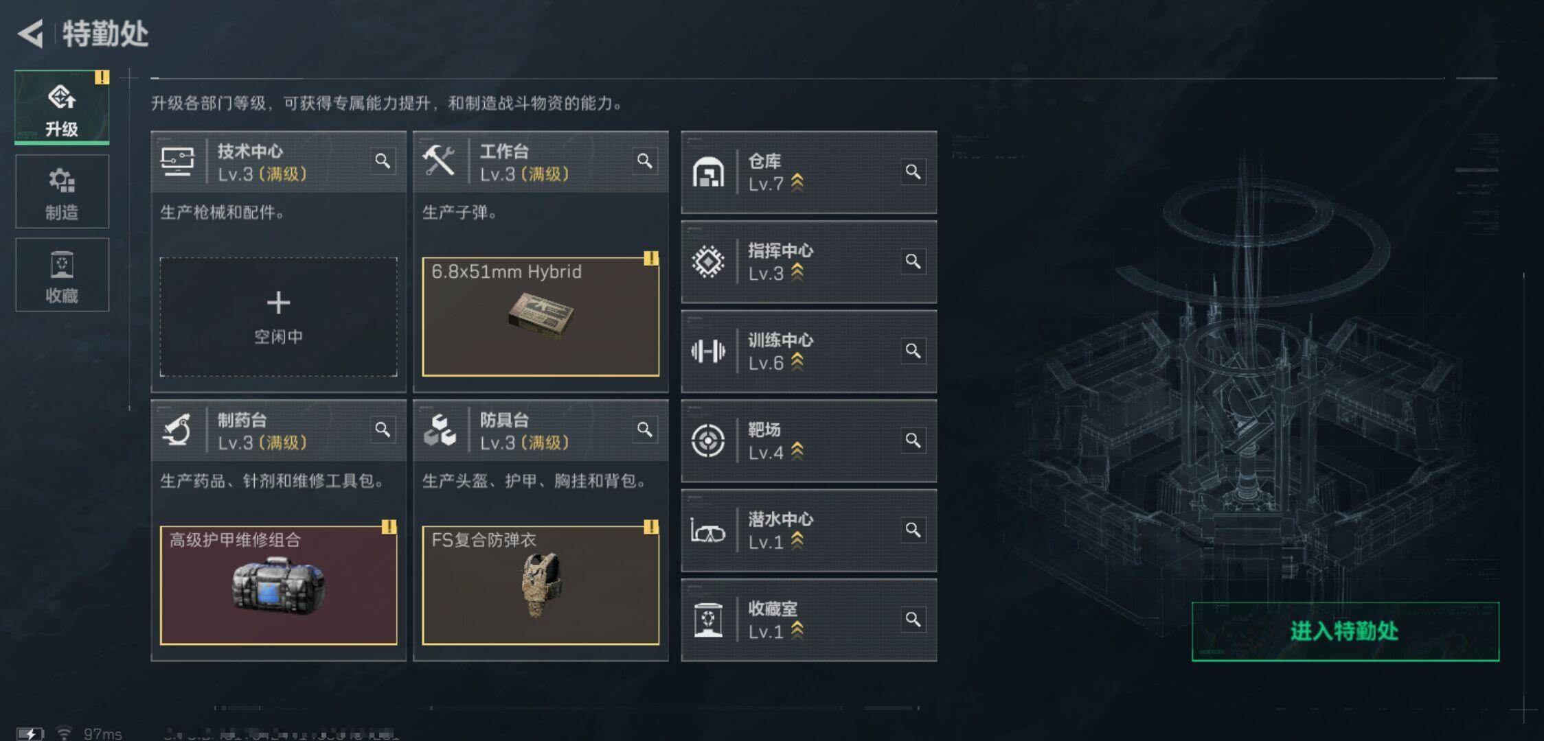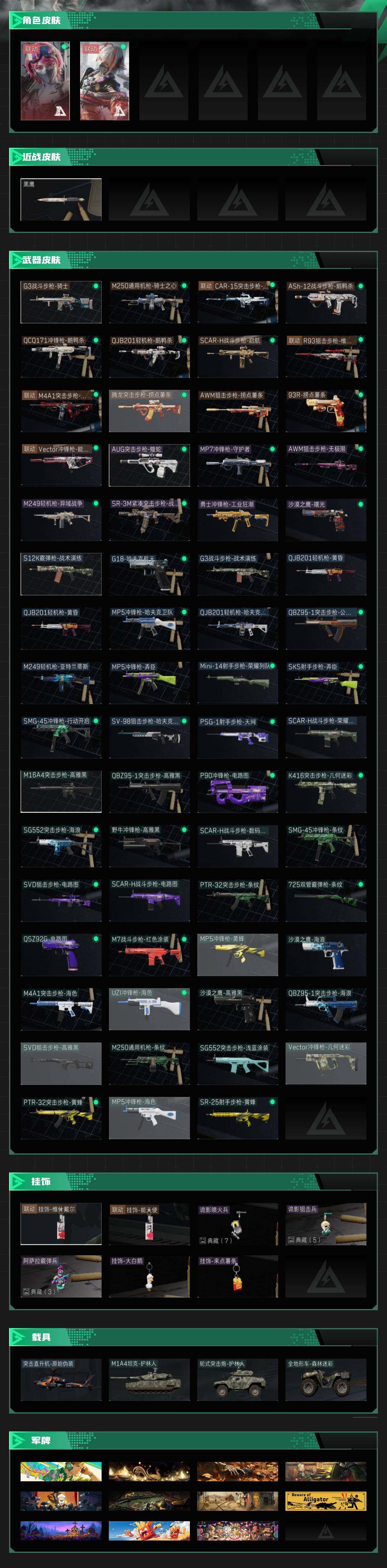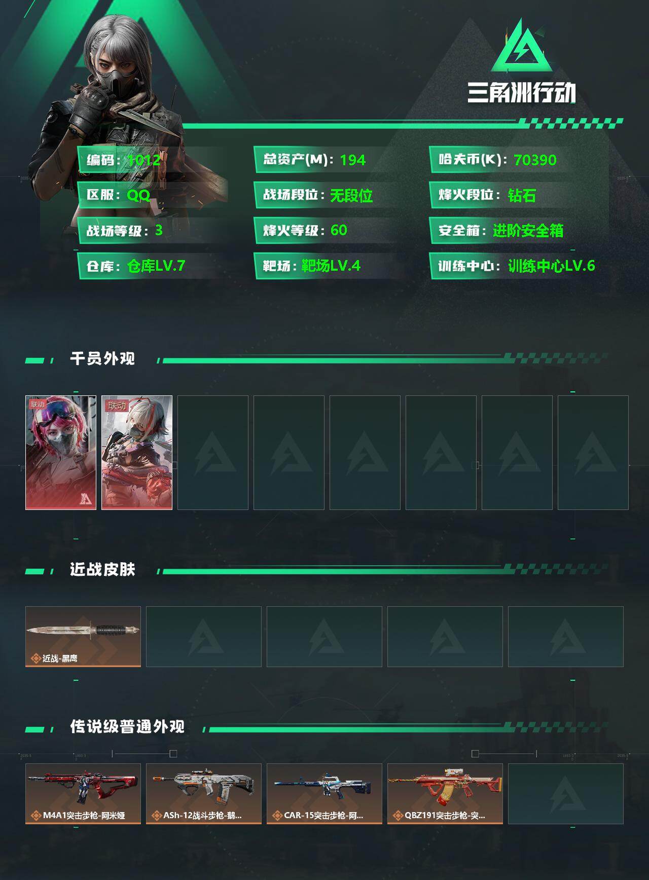 总资产:194.4M,哈夫币:7039W,武器皮肤63,烽火60级:钻石,战场3级:无段位,通行证46级:烽火地带限定版 【安全箱】高级安全箱;【特勤处等级】仓库LV.7,指挥中心LV.3,训练中心LV.6,靶场LV.4,潜水中心LV.1,收藏室LV.1;【干员皮肤2】:蛊能天使午夜邮差,骇爪维什戴尔;【已有捆绑包4】:捞点薯条捆绑包,能天使午夜邮差捆绑包,维什戴尔捆绑包,鹅鸭杀捆绑包;【近战皮肤】:近战武器-黑鹰;【步枪皮肤】:G3战斗步枪-骑士,CAR-15突击步枪-阿米娅,ASh-12战斗