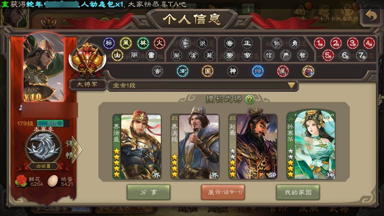 官阶:大将军;VIP等级:VIP10;史诗武将数量:54;动态皮肤数量:43;武将总数:388;史诗宝珠数量:0;将魂数量:0;神将:4;魏国史诗武将:26;蜀国史诗武将:8;吴国史诗武将:10;群史诗武将:20