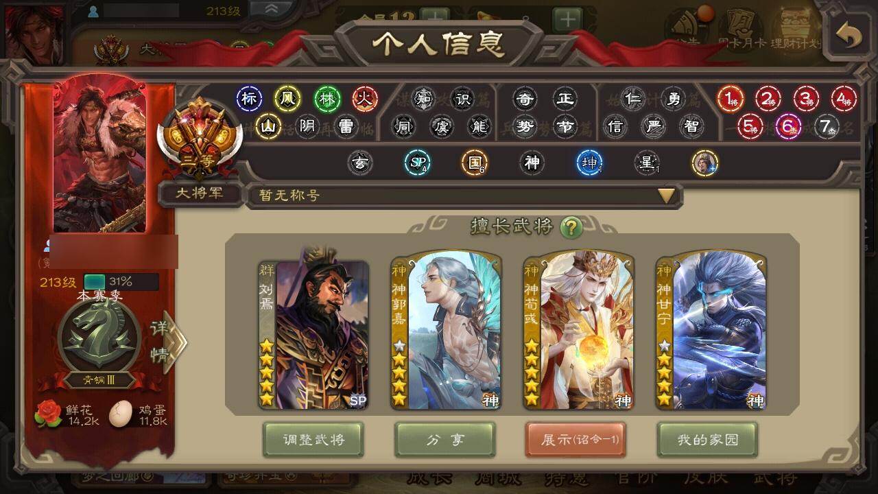 官阶:大将军;VIP等级:VIP12;史诗武将数量:45;动态皮肤数量:35;武将总数:359;史诗宝珠数量:4;将魂数量:4057;神将:7;魏国史诗武将:13;蜀国史诗武将:9;吴国史诗武将:6;群史诗武将:12
