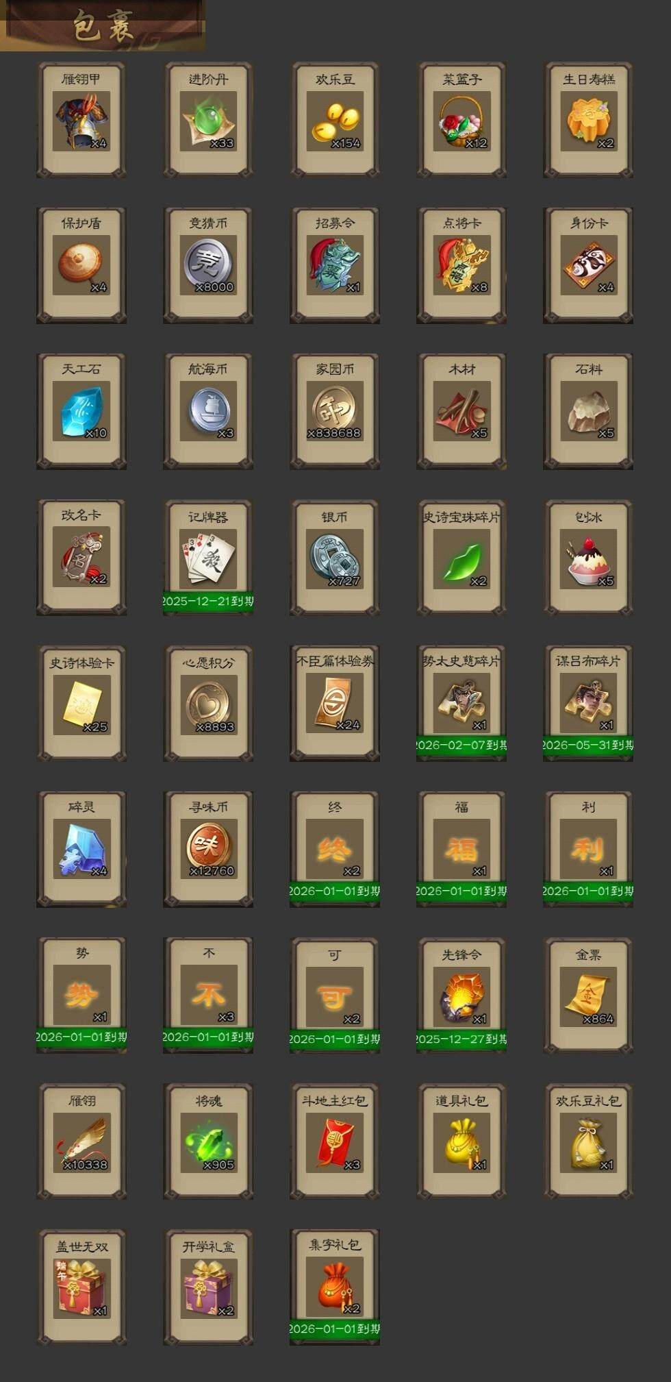 官阶:大将军;VIP等级:VIP12;史诗武将数量:60;动态皮肤数量:37;武将总数:402;史诗宝珠数量:0;将魂数量:905;神将:12;魏国史诗武将:20;蜀国史诗武将:14;吴国史诗武将:9;群史诗武将:12
