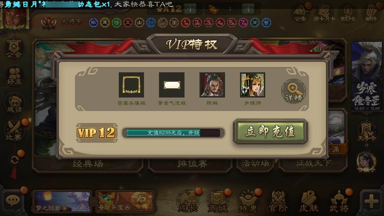 官阶:大将军;VIP等级:VIP12;史诗武将数量:60;动态皮肤数量:37
