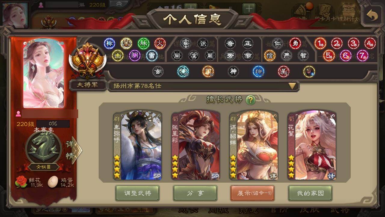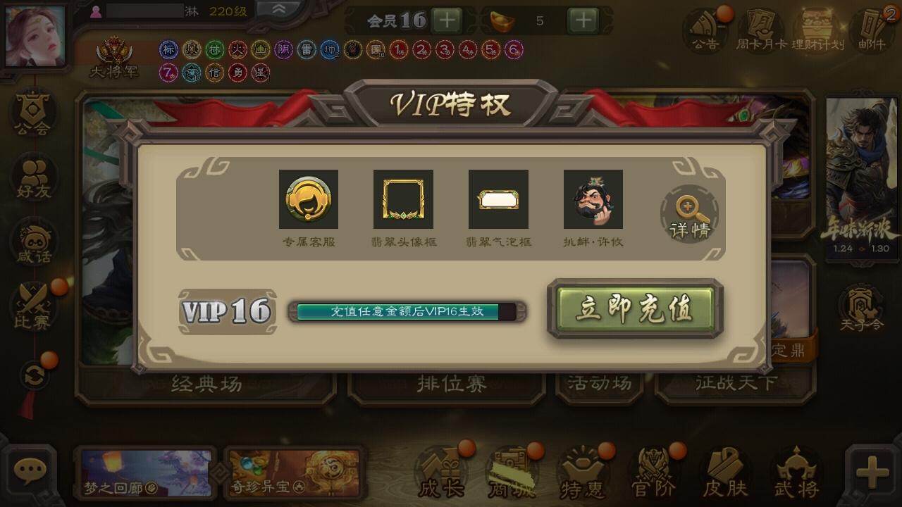 官阶:大将军;VIP等级:VIP16;史诗武将数量:98;动态皮肤数量:65