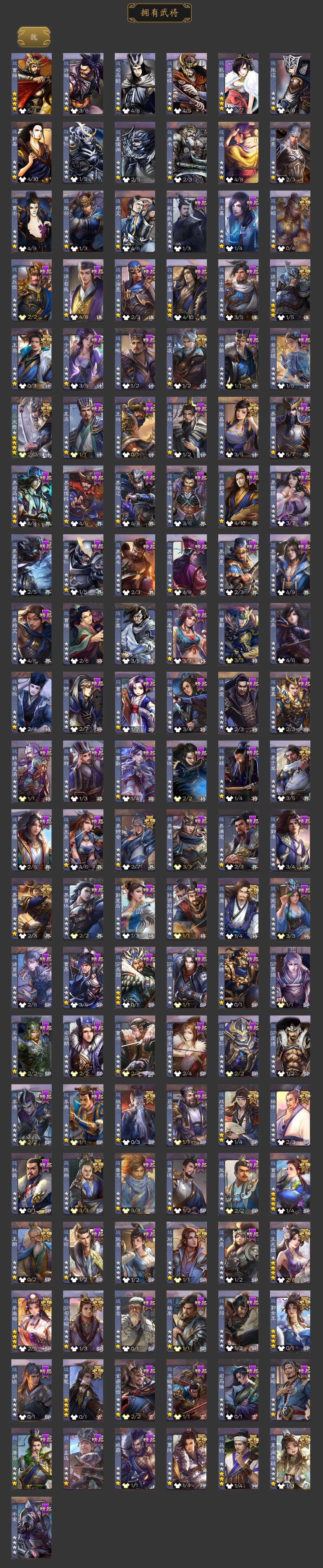 神吕布,神赵云,神陆逊,神刘备,神甘宁,神张辽,神郭嘉,神太史慈,神孙策,神荀彧,神诸葛亮,SP司马昭,曹髦,郭女王,星周不疑,谋曹仁,张昌蒲,王粲,杨修,羊徽瑜,王元姬,王凌,王朗,马钧,界钟会,界于禁,界曹真,嵇康,郝昭,陈琳,曹婴,曹纯,戏志才,刘晔,程昱,关索,谋诸葛亮