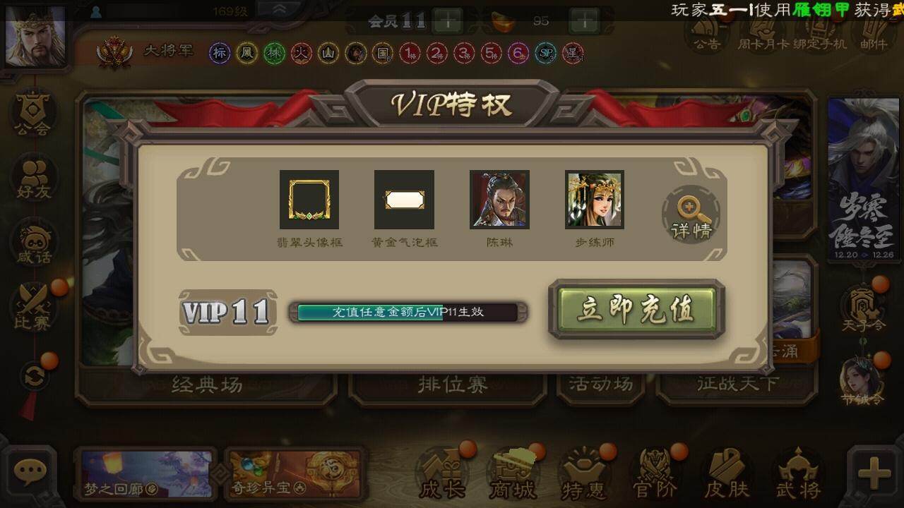 官阶:大将军;VIP等级:VIP11;史诗武将数量:44;动态皮肤数量:28