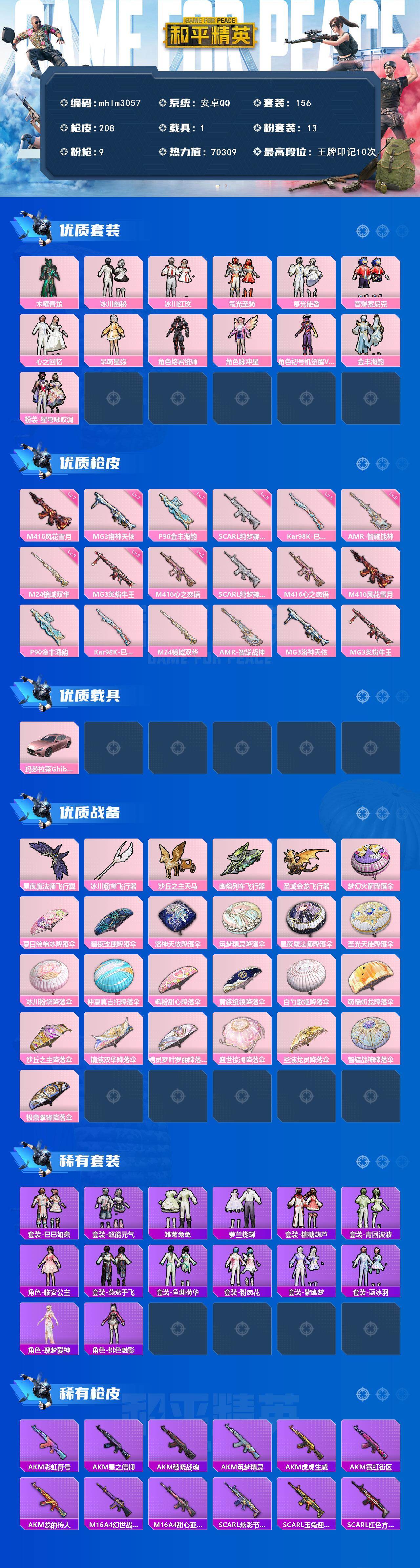 安卓 手Q-13粉装-9特效枪-1载具-5粉色飞行器-70309热力值-10王牌印记-156套装-208枪皮