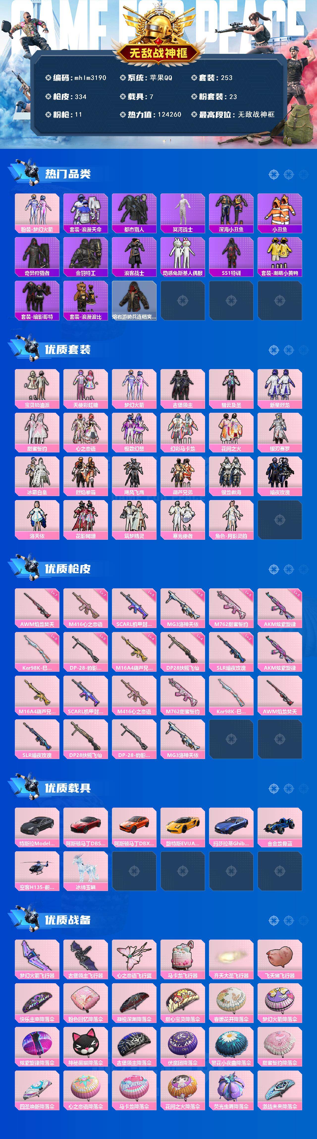 苹果 手Q-无敌战神框-23粉装-11特效枪-7载具-6粉色飞行器-124260热力值-22王牌印记-253套装-334枪皮
