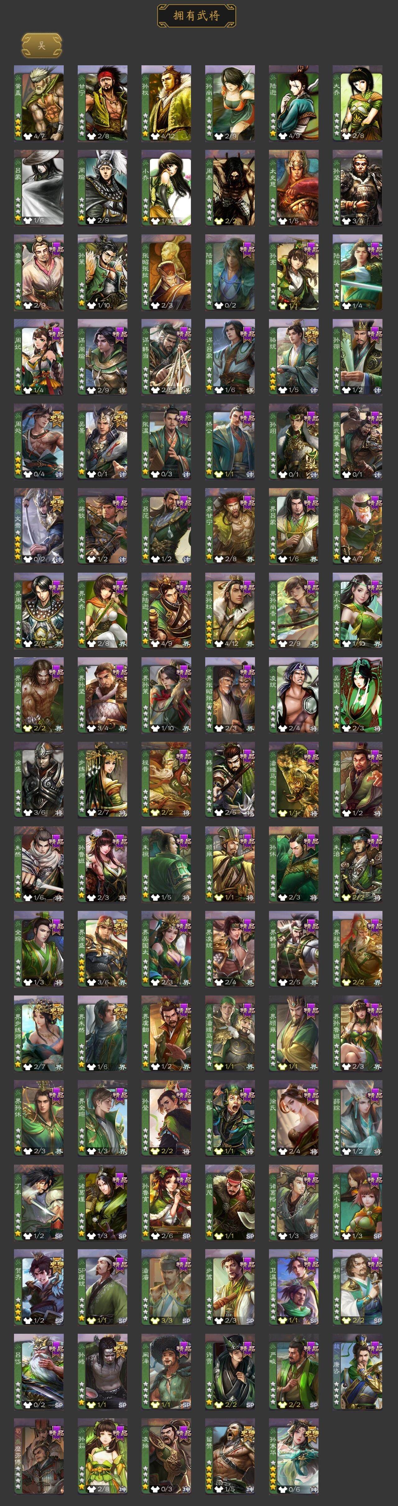 神曹操,神吕布,神赵云,神陆逊,神刘备,神甘宁,神张辽,神郭嘉,神太史慈,神孙策,神荀彧,神诸葛亮,SP司马昭,星周不疑,王粲,谋曹操,杨修,羊徽瑜,王元姬,王凌,司马师,马钧,界钟会,界于禁,界曹真,嵇康,郝昭,陈琳,曹婴,曹纯,戏志才,刘晔,程昱,关索,马云騄,谋黄忠,谋夏侯