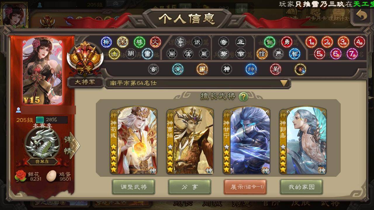 官阶:大将军;VIP等级:VIP15;史诗武将数量:88;动态皮肤数量:47