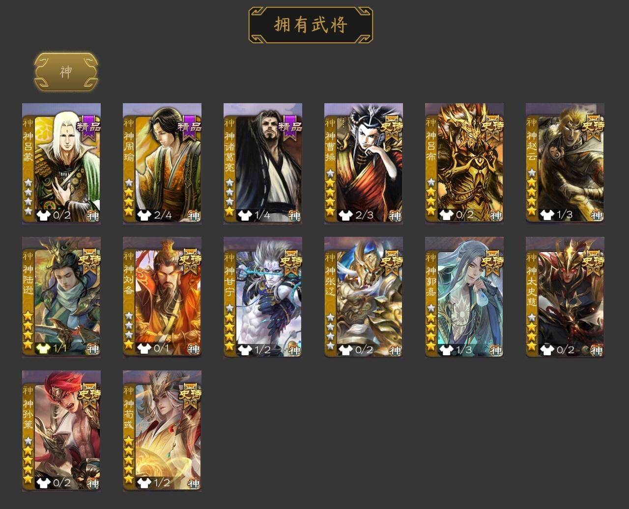 官阶:大将军;VIP等级:VIP15;史诗武将数量:88;动态皮肤数量:47;武将总数:458;史诗宝珠数量:2;将魂数量:40;神将:12;魏国史诗武将:26;蜀国史诗武将:16;吴国史诗武将:12;群史诗武将:29