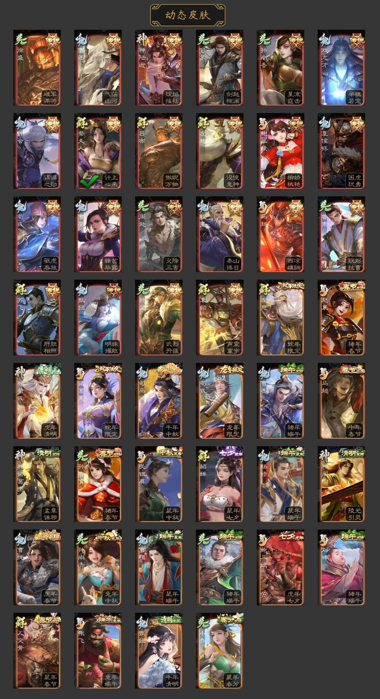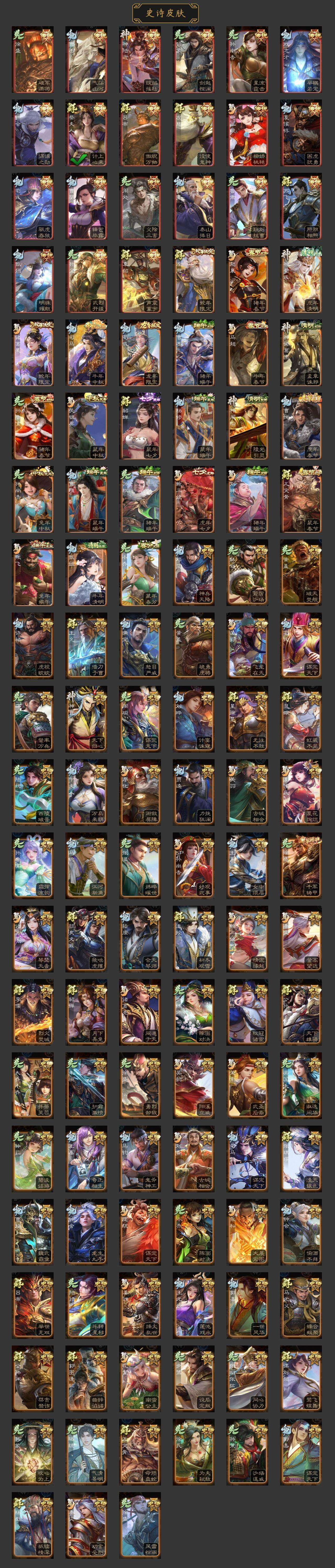神吕布,神赵云,神陆逊,神刘备,神张辽,神诸葛亮,杨修,王凌,司马师,马钧,界钟会,界于禁,嵇康,陈琳,曹婴,曹纯,戏志才,刘晔,谋曹丕,程昱,关索,马云騄,谋赵云,赵襄,张星彩,王平,沙摩柯,谯周,界黄忠,花鬘,董允,鲍三娘,周处,吴景,孙皓,骆统,界朱然,界徐盛,贺齐,左慈,