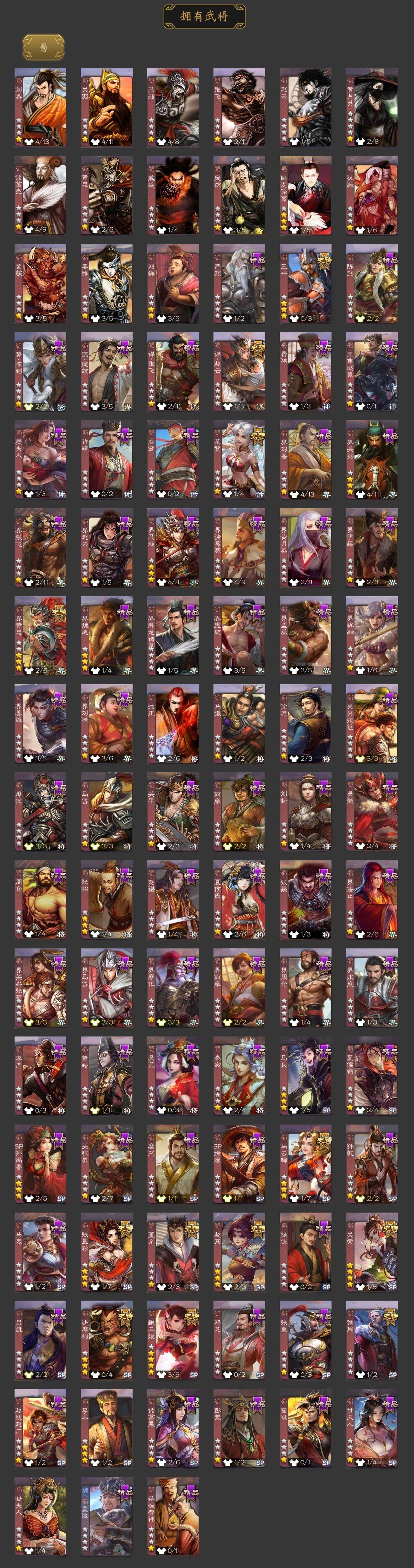 官阶:大将军;VIP等级:VIP10;史诗武将数量:57;动态皮肤数量:41;武将总数:410;史诗宝珠数量:0;将魂数量:1312;神将:6;魏国史诗武将:29;蜀国史诗武将:12;吴国史诗武将:7;群史诗武将:19