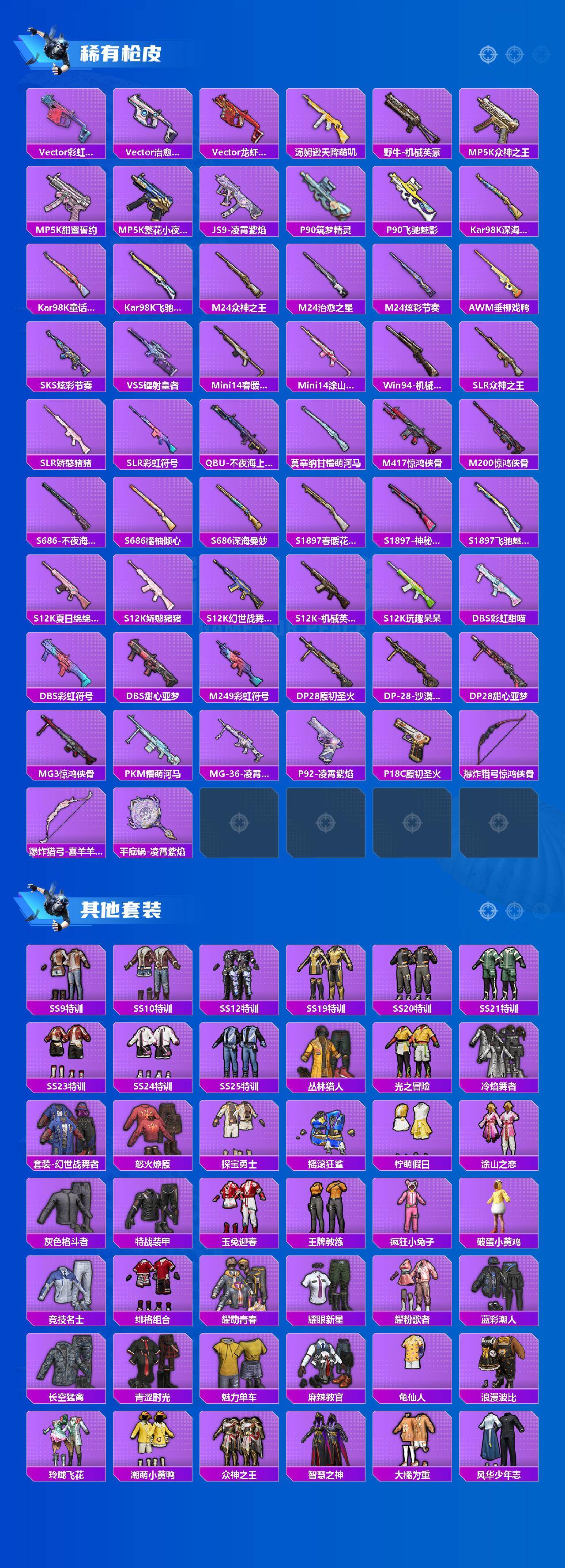 【粉色枪皮等级】:AKM-炫紫旋律(五级),M416-心之恋语(六级),Kar98K-伏魔团(五级),M249-彩虹甜喵(五级)