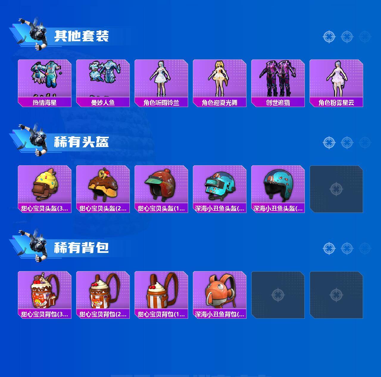 【热门品类】:套装-浪漫天命,套装-都市猎人,套装-小丑鱼,角色-军刀雅典娜,套装-潮萌小黄鸭,套装-浪漫波比,套装-红熊茄茄