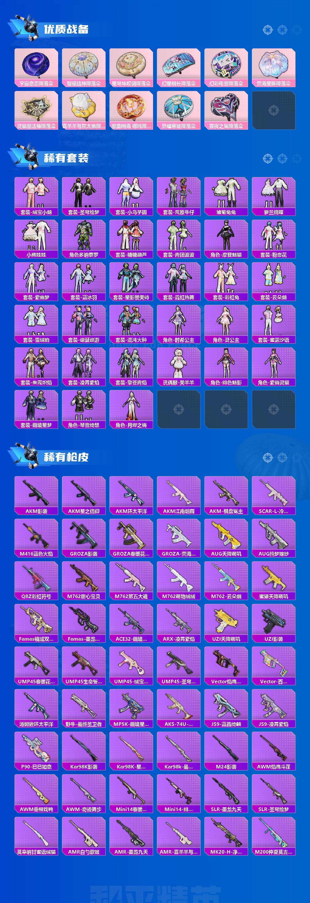 【粉色套装】:粉装-甜心巧克力,粉装-宝贝奶油派,粉装-天使彩虹糖,粉装-彩虹鹿灵,角色-复仇流浪者,粉装-垂柳戏鸭,粉装-冰川粉黛,粉装-冰川幽秘,角色-歌者泠鸢,粉装-第五大道,角色-呆萌星弥,角色-小可学妹,角色-烟云彩露,角色-电磁星,角色-初号机 觉