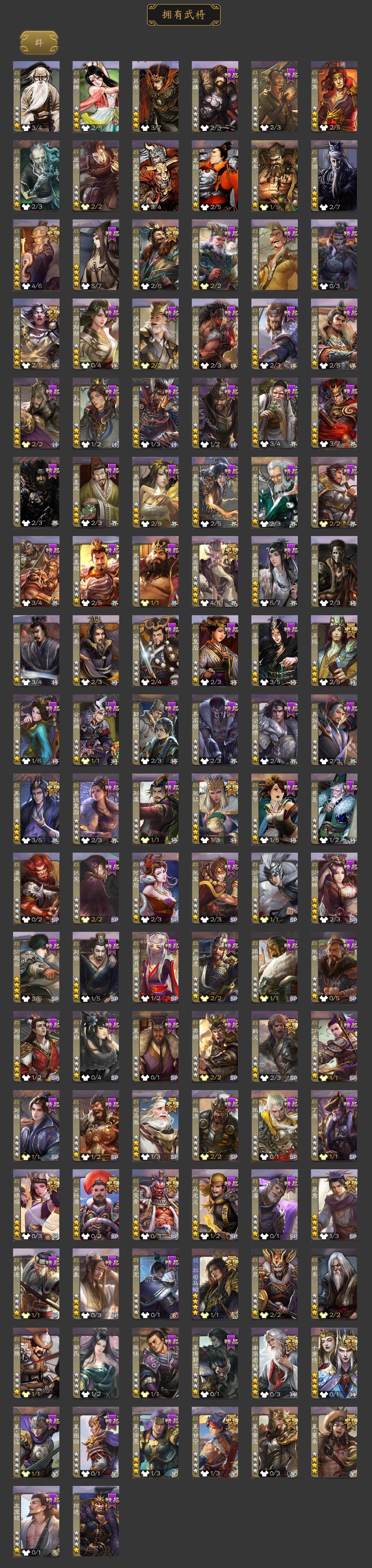 神吕布,神赵云,神司马懿,神刘备,神张辽,神郭嘉,神太史慈,神诸葛亮,星周不疑,王元姬,界钟会,界曹真,嵇康,郝昭,曹婴,曹纯,戏志才,刘晔,蒋干,清河公主,程昱,马云騄,谋赵云,谋马超,诸葛瞻,周群,赵襄,张星彩,王平,沙摩柯,谯周,界黄忠,花鬘,董允,周处,骆统,留赞,界朱然,