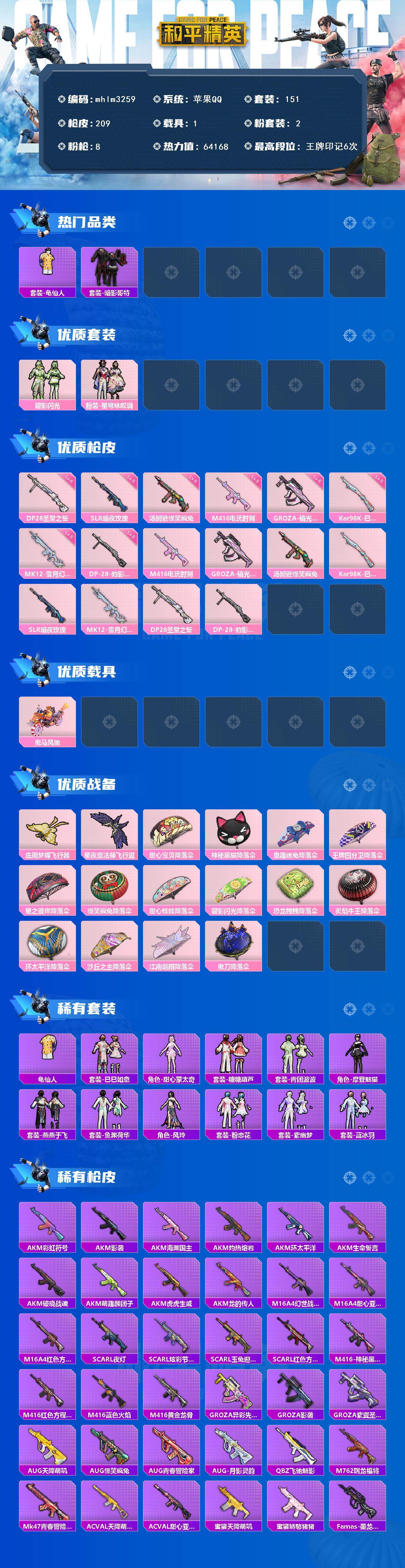 苹果 手Q-2粉装-8特效枪-1载具-3粉色飞行器-64168热力值-6王牌印记-151套装-209枪皮