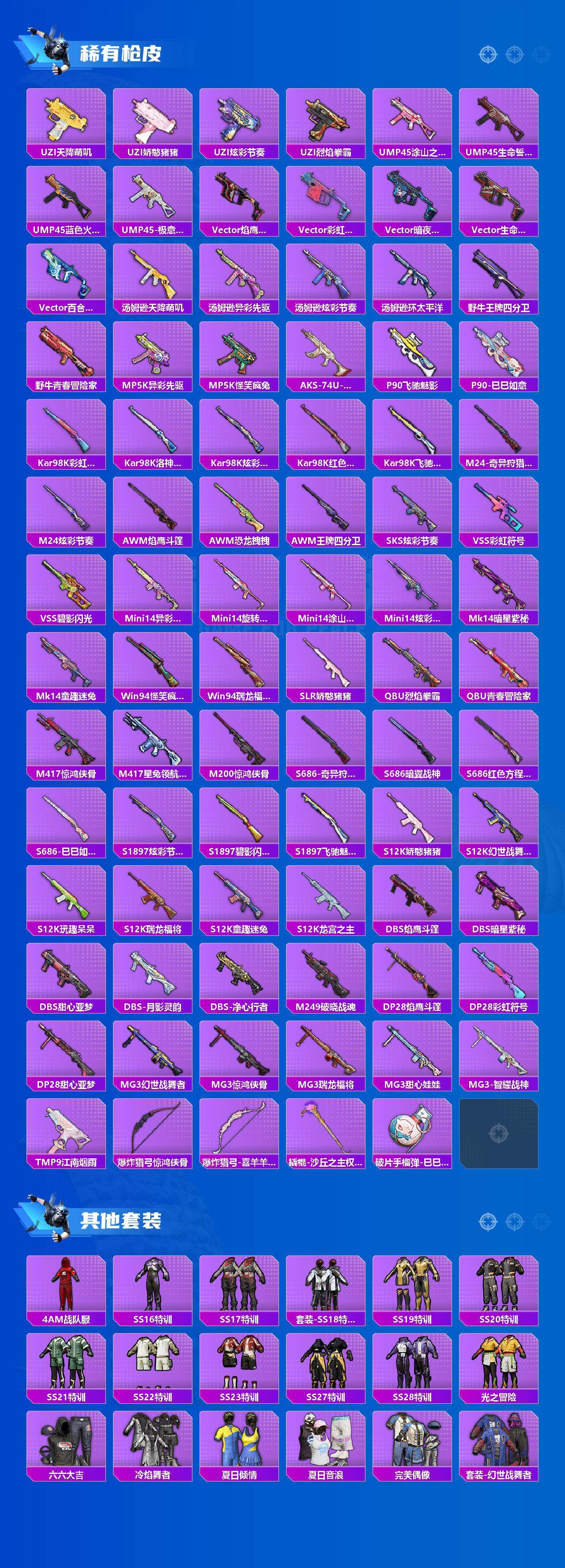 【粉色枪皮等级】:M416-电玩时刻(五级),GROZA-镜光银凌(五级),汤姆逊-怪笑疯兔(五级),Kar98K-巳巳如意(五级),SLR-暗夜玫瑰(五级),MK12-雪月幻音(五级),DP-28-圣堂之誓(六级),DP-28-豹影疾电(五级)